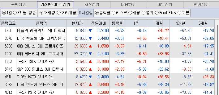 위 미국 주식 매수 순위를 보면, 레버리지 ETF인 SOXL, TQQQ, TSLL 3개가 5위 안에 있는 것을 확인할 수 있습니다. 그만큼, 많은 투자자가 레버리지 ETF를 투자하고 있습니다.