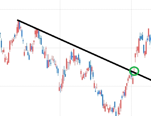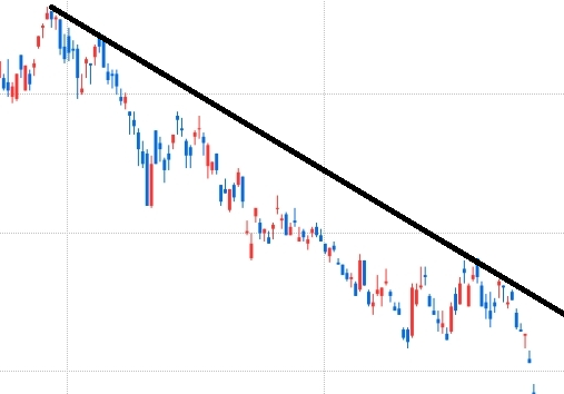 하락 추세는 주가의 낮아지는 고점을 연결한다. 위 차트처럼 하락 추세 시작점의 고점과 현재 주가의 고점을 연결해 추세선을 긋는다. 해당 추세선은 선에 주가가 닿으면 다시 하락할 확률이 높고, 주가가 선을 돌파하면 주가가 상승함을 의미한다.