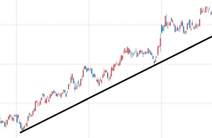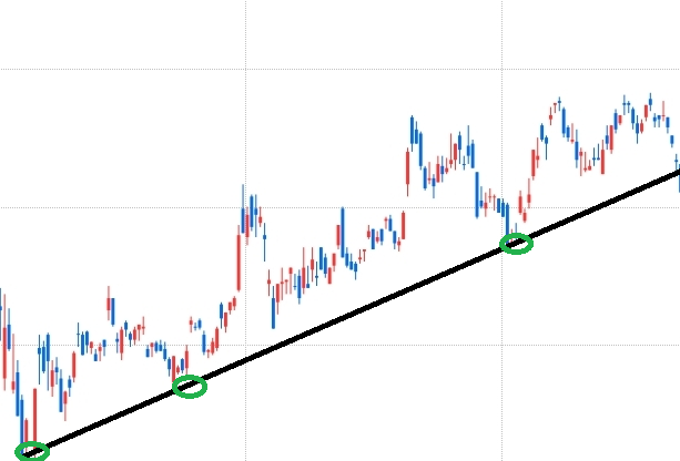 상승 추세는 일반적으로 주가의 높아지는 저점을 연결한다. 위 차트처럼 상승 추세 시작점의 저점과 현재 주가의 저점을 연결해 추세선을 긋는다. 해당 추세선은 선에 주가가 닿으면 반등할 확률이 높고, 주가가 선을 뚫고 떨어진다면 주가가 하락함을 의미한다.