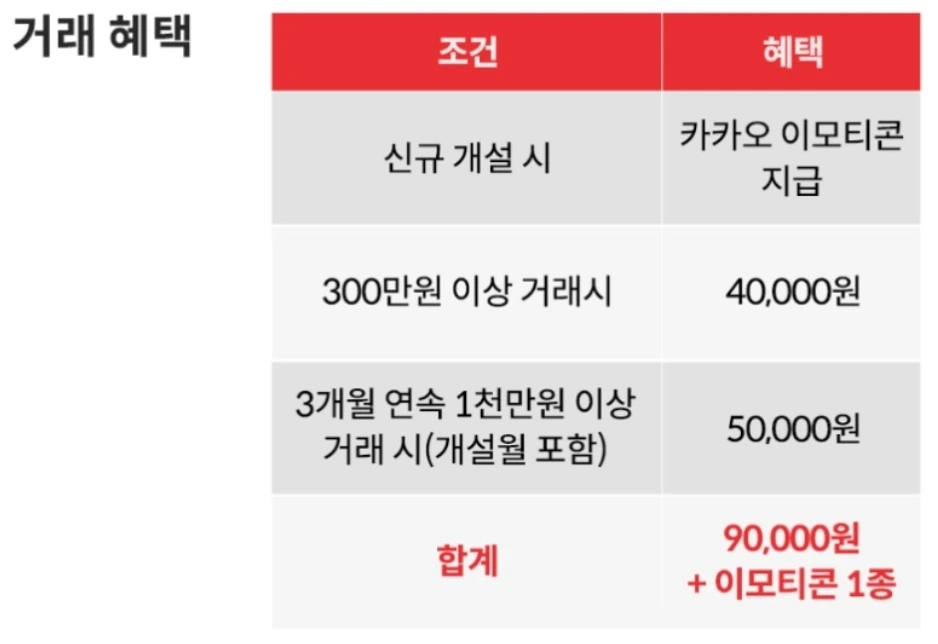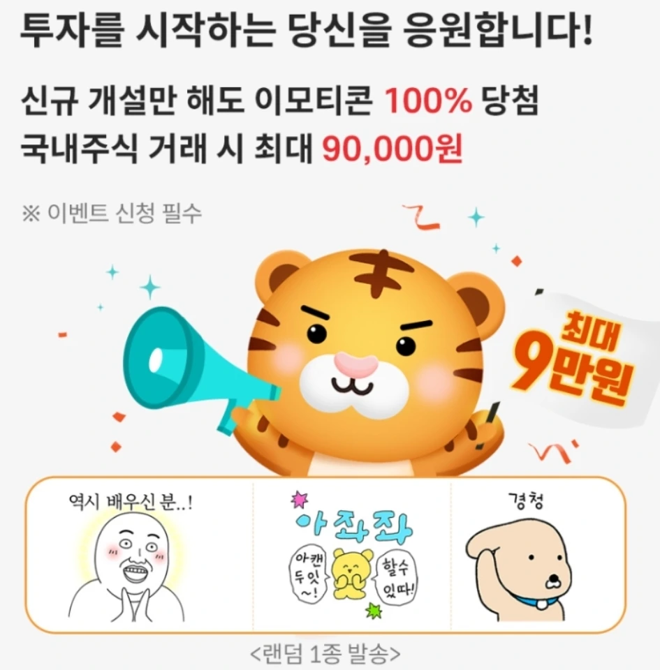 유진투자 증권에서는 계좌 신규 개설 시 카카오 이모티콘을 제공한다. 300만 원 이상 거래 시 40,000원 / 3개월 이상 연속 1천만 원 이상 거래 시 50,000원을 제공한다. 혜택 조건이 있지만 지급 금액이 큰 편이다.