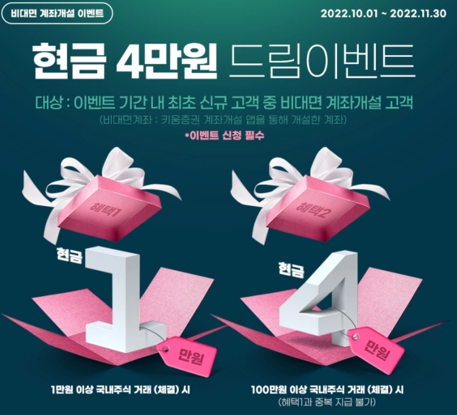 키움 증권에서는 현금 4만 원 혜택을 제공한다. 1만 원 이상 국내 주식을 거래하면 1만 원을 제공하며 100만 원 이상 국내 주식 거래 시 4만 원을 제공한다.