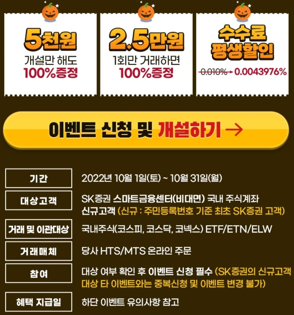 SK증권은 계좌 개설 시 5,000원을 제공하고 1회 거래 시 25,000원을 제공한다. 추가로 수수료 평생 할인 혜택도 같이 제공한다.