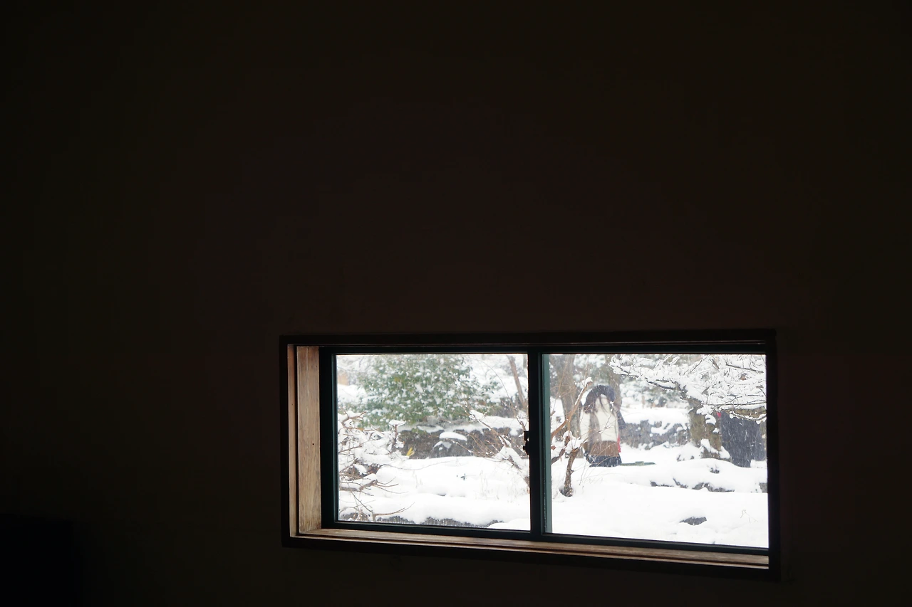 지난 밤에 내린 눈길 위를 조심스럽게 움직이며 김영갑 갤러리 ‘두모악’ 입구로 진입합니다. 두모악은 제주의 사진작가였던 김영갑작가가 직접 만든 작업실이자 갤러리입니다. 충남 부여에서 태어난 그가 제주의 풍광에 빠져 20년을 넘게 제주를 카메라에 담았고 루게릭병을 진단받고 투병을 하면서도 사진 작업에 몰두한 그의 삶과 혼이 담긴 자리입니다. 눈이 소복히 쌓인 갤러리 정원의 동백과 감나무도 그의 사진 속 풍경처럼 아름답게 빛나고 있습니다. 그의 사진과 제주에 대한 열정에 이끌린 많은 사람들이 폭설로 길이 끊긴 날에도 갤러리 안을 가득 메우고 있습니다. 파노라마 사진에 담긴 제주의 오름과 바람, 바다, 하늘은 생생하게 살아서 그가 남기고 간 이야기를 여전히 들려주고 있습니다. 그의 사진처럼 가로로 긴 창이 있는 자리에 앉아 오랫동안 시간을 보냅니다. 창밖으로 보이는 사람들과 정원의 풍경이 시간의 흐름을 잊게 만들고 있습니다.