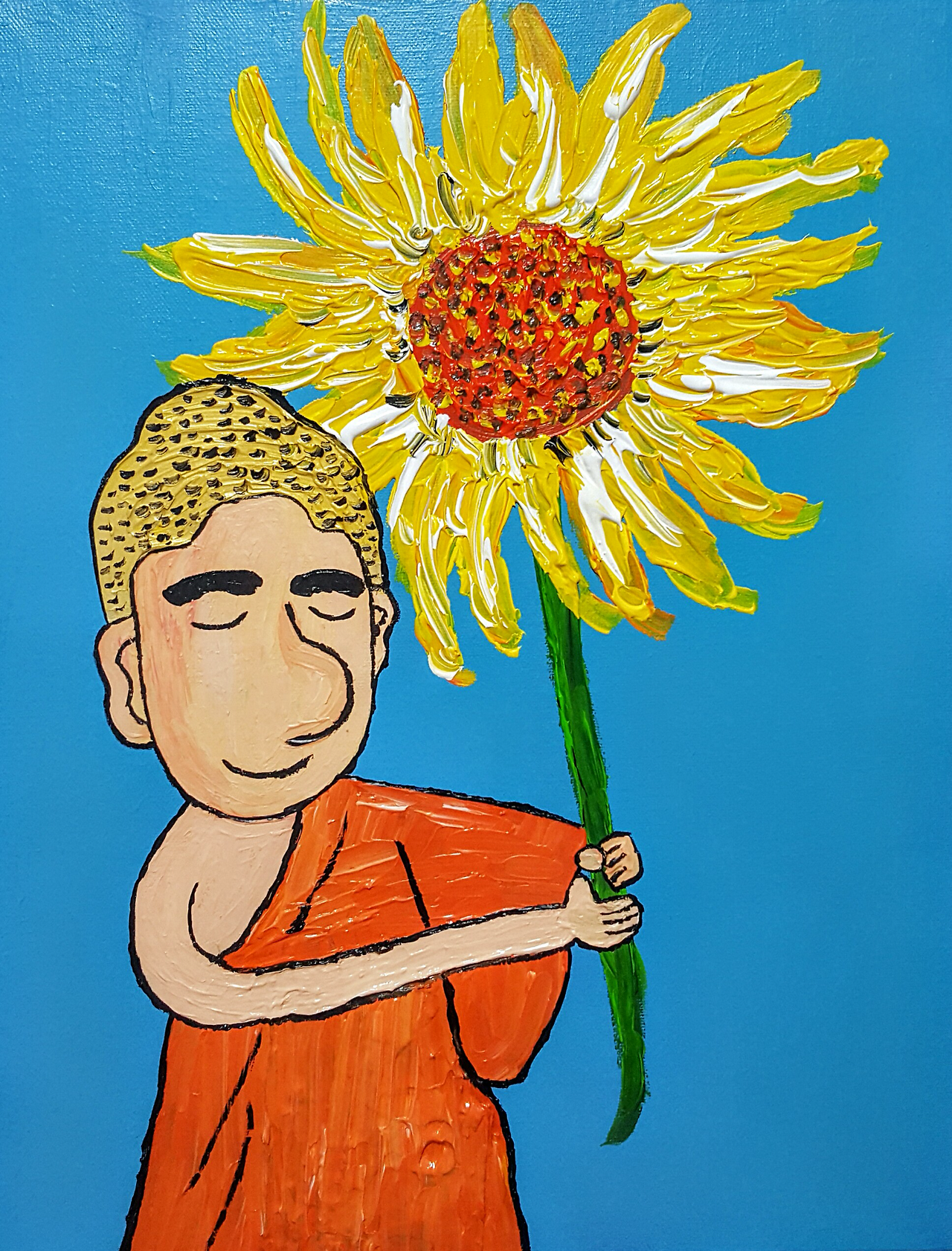 절대적 진리를 묻는 제자에게 꽃을 들어보이는 붓다와 그 마음을 알아듣고 미소로 화답하는 '염화미소'의 이야기가 있습니다. 진심은 설명하기 어렵습니다. 마음과 마음이 바로 닿아야 합니다. 해바라기를 들고 미소 짓는 부처의 모습을 보면서 함께 입꼬리를 살짝 올려 웃어 보세요. 잠시라도 마음이 편안해 집니다.