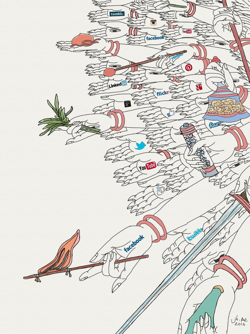 '천수천안관음보살'은 천개와 눈과 손으로 중생의 고락을 돌보는 보살입니다. 세상의 모든 곳을 눈으로 살피고 도와주는 것이지요. 그런 천수천안관음이 우리가 늘 사용하는 SNS에도 있다는 생각해보신 적 있으세요? 모든 사람은 부처의 마음을 갖고 있습니다. 온라인에서도 부처의 이야기를 들을 수 있고, 나눌 수 있습니다. 우리가 바로 부처니까요.