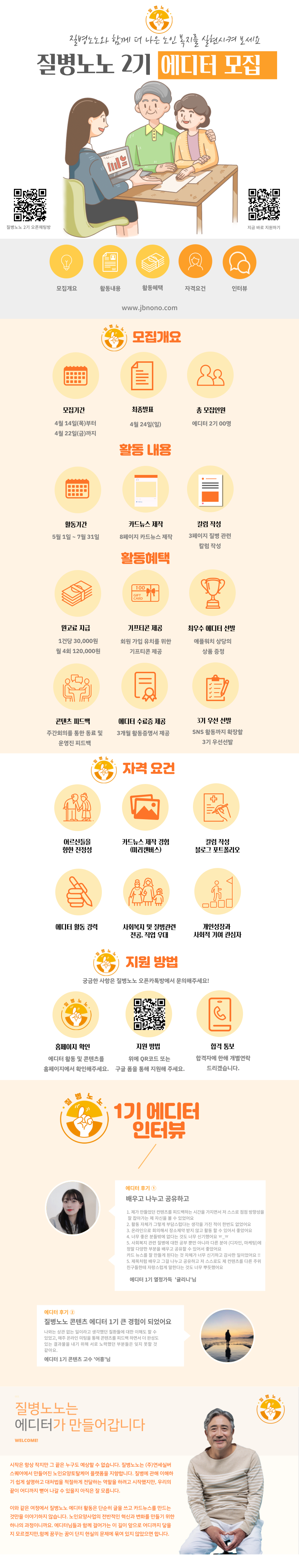 우리는 각종 자료를 토대로 정한 10대 노인성 질환에 대한 콘텐츠를 제작하였다. 그리고 3개월간 이 콘텐츠를 제작하는 에디터 1기의 활동이 종료되었고, 현재 2기를 모집하고 있다. 2기를 모집하는 과정에 대한 전체적인 계획을 팀원들과 나누고, 실질적인 2기 에디터 공고와 관련된 실무적인 부분은 내가 진행하였다.