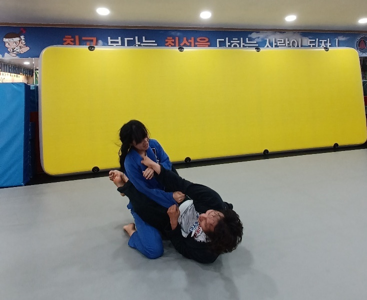 경기가 시작되자마자 내가 먼저 상대의 클로즈가드를 잡으려 했지만, 뜻대로 되지 않았다. 결국, 내가 클로즈가드를 잡히고 말았다. 우리 팀 세컨은 “이모, 무조건 풀어야 해요. 무릎 넣어요!”라고 외치며 열심히 코칭해 주었지만, 연습이 부족했던 탓에 무릎을 제대로 넣지 못했다. 그렇게 나는 뒤집혔고, 상대는 마운트 포지션을 잡았다.