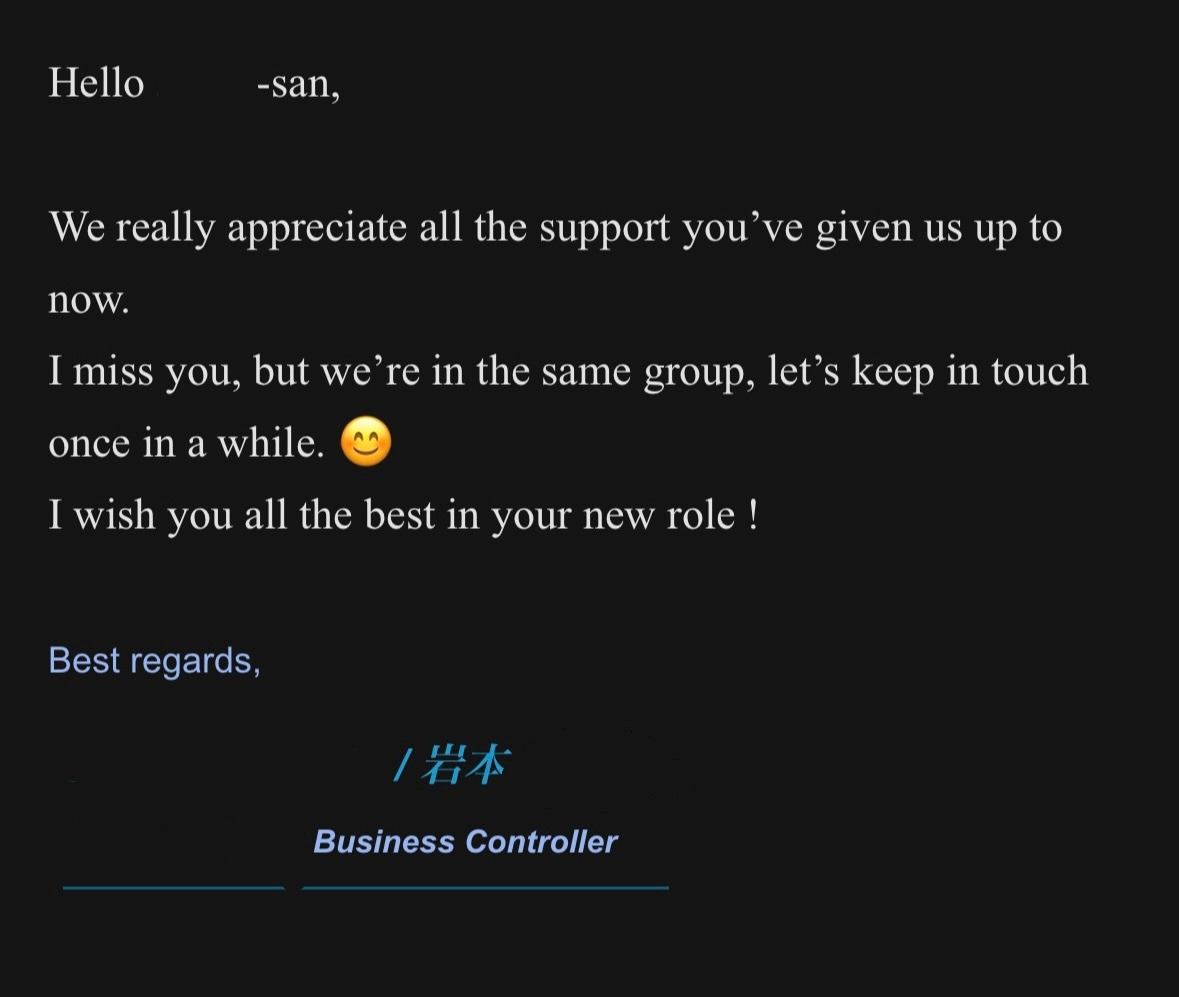 그러던 와중 최근 회사에서 업무(role)가 변경되었다. 함께 일하던 일본팀 동료에게 인사를 고하며 나의 업무를 도맡아 줄 새로운 담당자를 소개하는 메일을 썼는데, 어제 아래의 메시지가 담긴 메일을 회신받아서 삭막하게 업무 내용만 오가던 아웃룩(Outlook)에 따뜻한 기운이 도는 순간이 있었다.