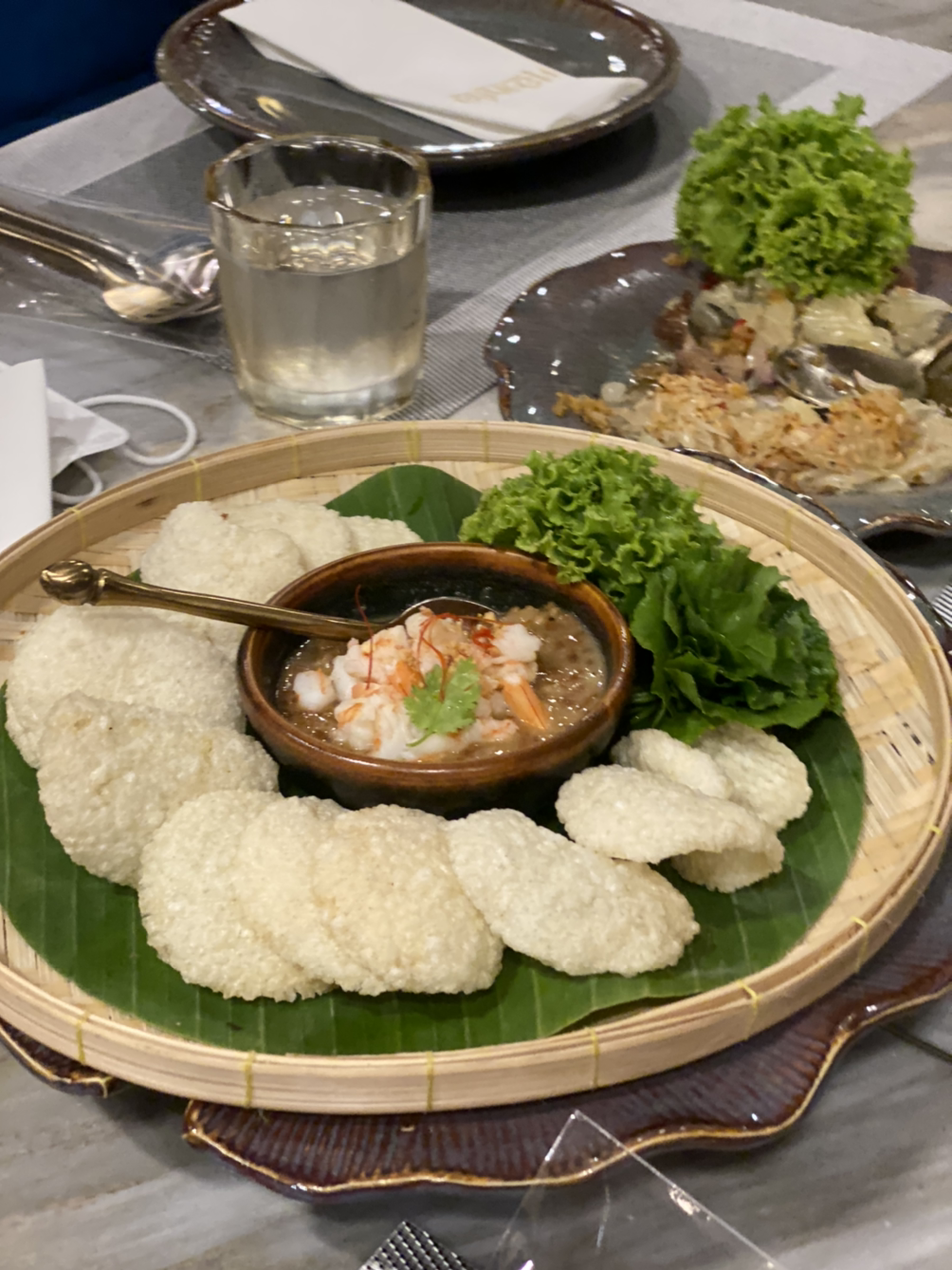 약간 한국 과자 '알새우칩'에 땅콩 소스를 곁들인 새우요리 느낌
