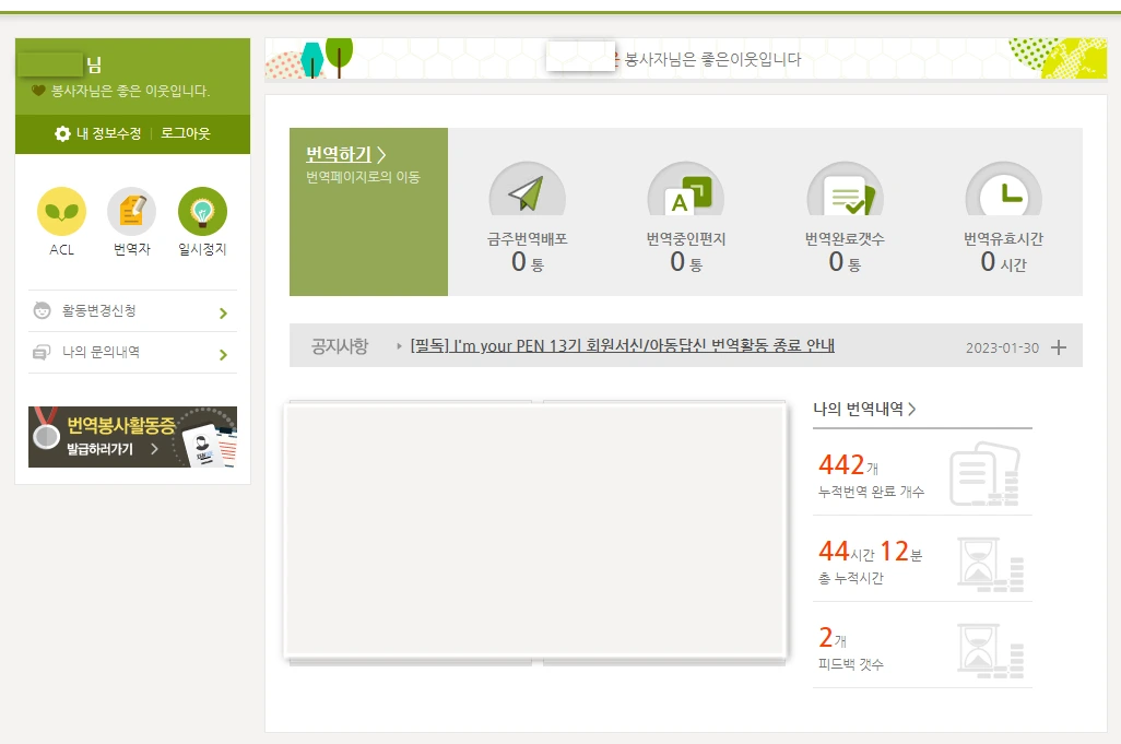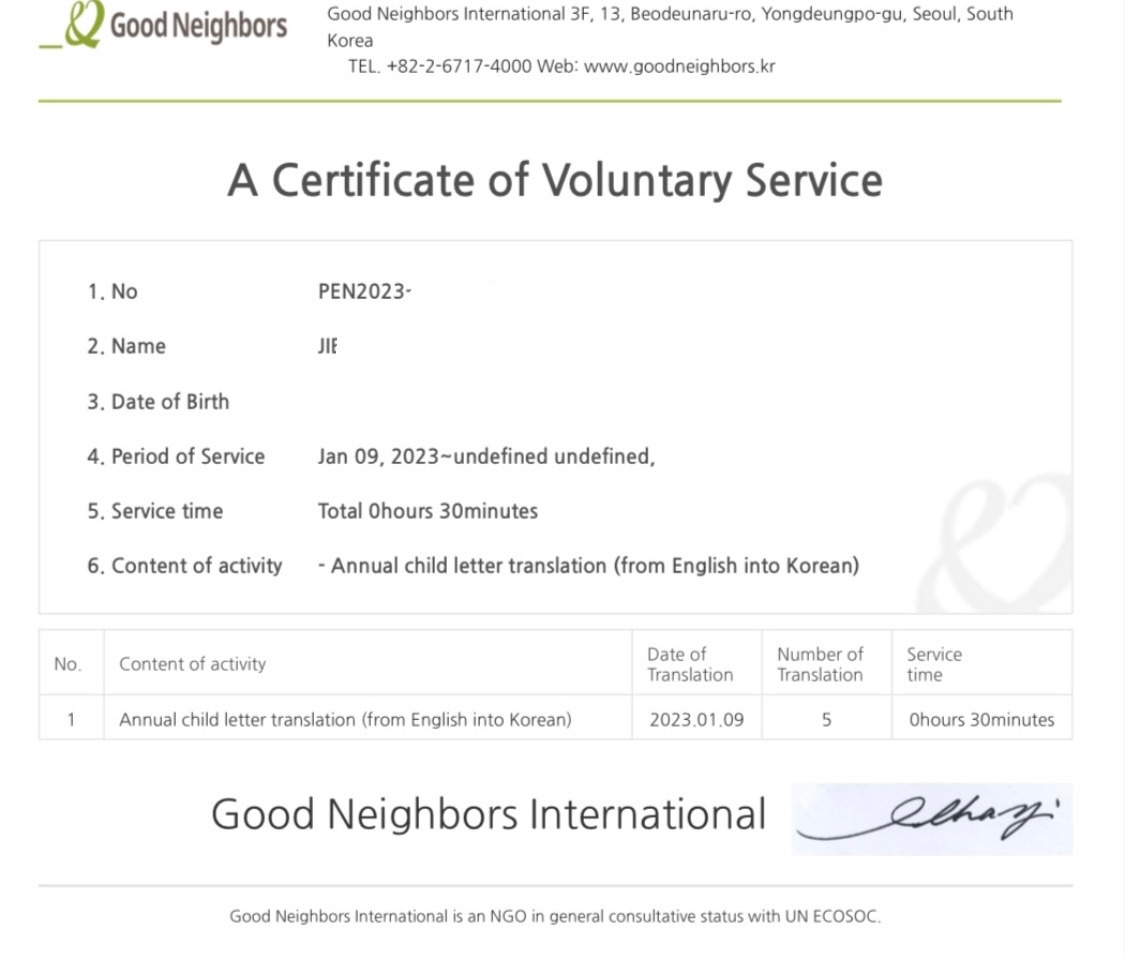 그 당시에는 매월 5,000원이었고 지금은 통장에서 매월 35,000원이 기부금으로 지출되고 있다. 그리고 작년에 추가된 게 있다면 바로 ‘번역 봉사’ 활동이다. 내가 가지고 있는 것 중에 도움이 될만한 일이 뭐가 있을까? 고민하다가 ‘언어’가 떠올랐고 ‘굿네이버스 아임유어팬 13기’ 번역봉사 활동에 신청하여 번역 봉사자로 선정되어 2022년 8월부터 약 7개월간의 번역 봉사 활동을 마쳤다. 총 번역 완료된 건은 442개, 누적 시간으로 합산하면 44시간 12분이다. 주 1회 간격으로 번역물이 담당자에게 배포되었으니 일주일에 약 12건의 편지를 번역한 셈이다.