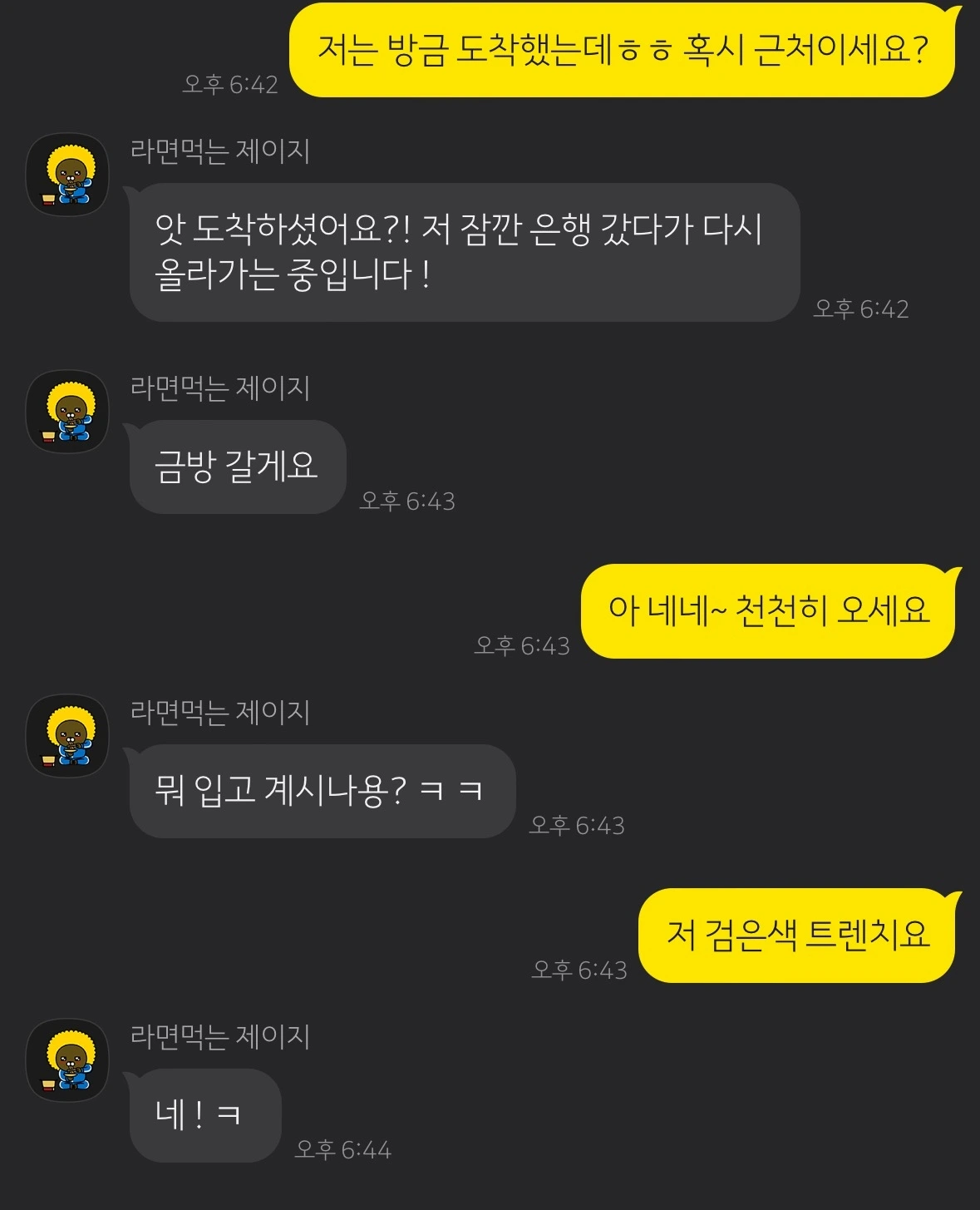 나 : 저는 방금 도착했는데ㅎㅎ 혹시 근처이세요?
