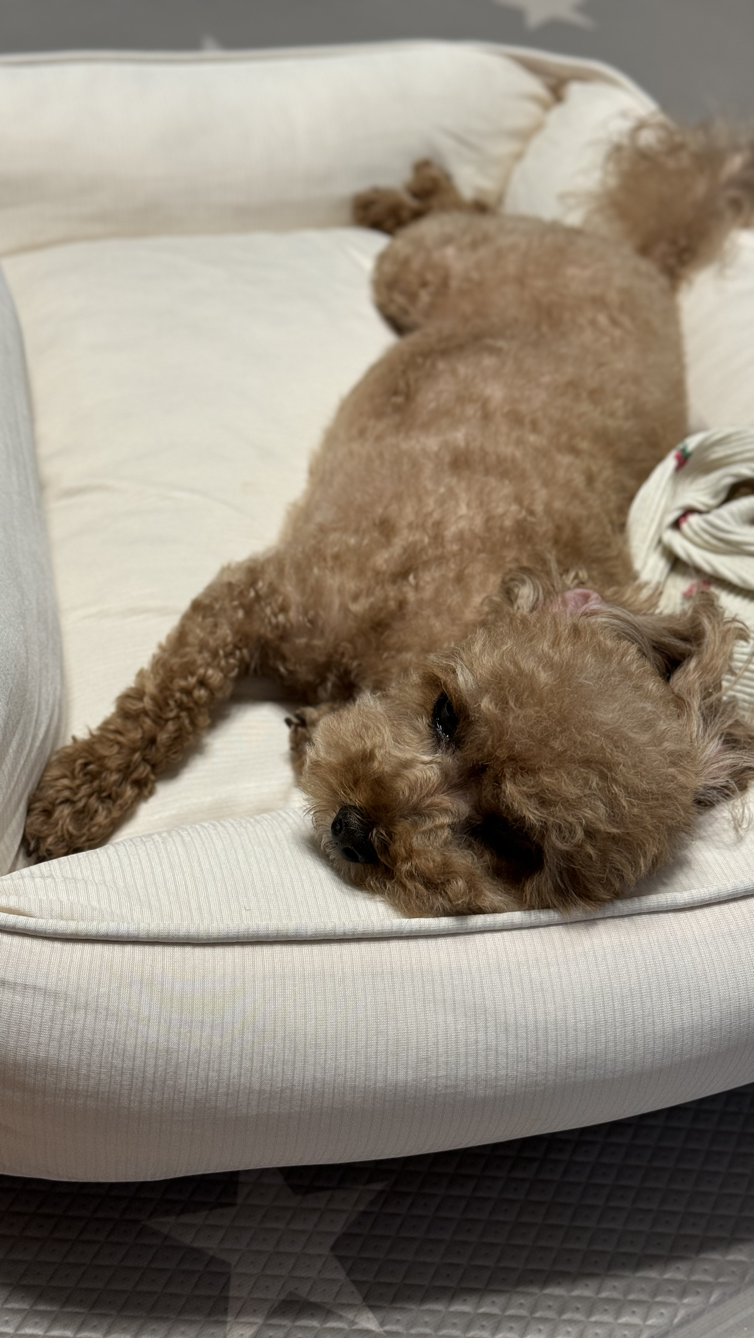 우리 집 개를 토대로 푸들의 특징을 나열해 보자면 '똑똑하다' 가족들의 말과 기분을 살피고 행동한다, '애교가 많고 자기주장이 강하다' 원하는 것이 있을 때 배를 뒤집어 까는 발라당 포즈나 귀여운 소리를 내며 안 주고는 못 배기게 애교를 부리는데 늘 우리가 진다.. 그리고 '체력이 약하다' 호두는 어릴 적에 슬개골 탈구가 와서 한차례 수술을 했는데 그 이후부터 체력이 약해서 오래 걷지 못하고, 적당히 걷다가 가족들이 품에 안고 산책을 마무리하는 편이다. 또 하나 놀라운 사실은 '입이 까다롭다'는 것! 이건 정말 푸들을 키우며 알게 된 사실인데 예전에 잠시 함께했던 시츄는 먹성이 좋아서 자고 있다가도 사료통을 흔들면 잠에서 깨서 달려오고는 했던 반면 호두는 사료를 주려고 하면 집으로 도망간다. 정말 먹는 것을 좋아하지 않는지(?) 까까는 물론 예외이지만.. 하루에 한 끼 먹는데 호두 입맛에 맞을만한 사료를 찾기 위해 전국 사료 샘플은 다 구매해보기도 했다. 정말이지 입이 까다롭다. (지금도 밥 먹이기가 제일 힘들다..)