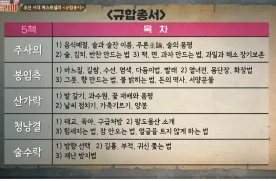빙허각 이 씨의 <규합총서>는 총 5권으로 되어 있는데, 1권 주사의(酒食議, 음식조리법)에는 390 여종의 음식. 약주제조법, 장 담그는 길일, 야채를 오래 보관하는 법, 겨울에 야채를 기르는 법 등의 내용이 있다고 하며, 이외에도 봉임측(縫紝則, 바느질 관련), 산가락(山家樂, 재배 및 가축 사육 관련), 청낭결(靑囊訣, 육아·구급 관련), 술수략(術數略, 집방향 길흉, 택일, 부적 관련) 등으로 구성되어 있다.