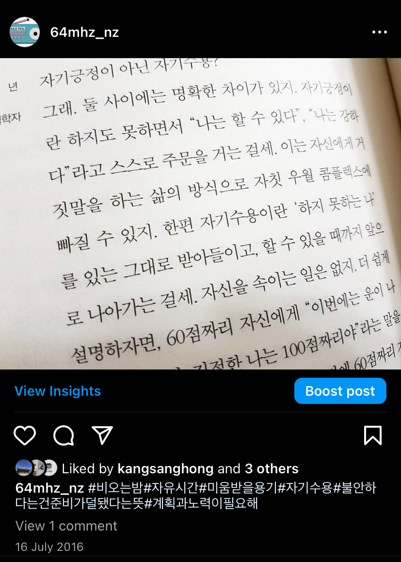 뉴질랜드 국가번호 64, 라디오주파수 MHz(메가헤르츠). 일상에서 전해지는 모든것을 수신하고, 감정과 생각을 담아 다시 글로 세상애 전송하는 라디오 주파수입니다. [ON AIR]