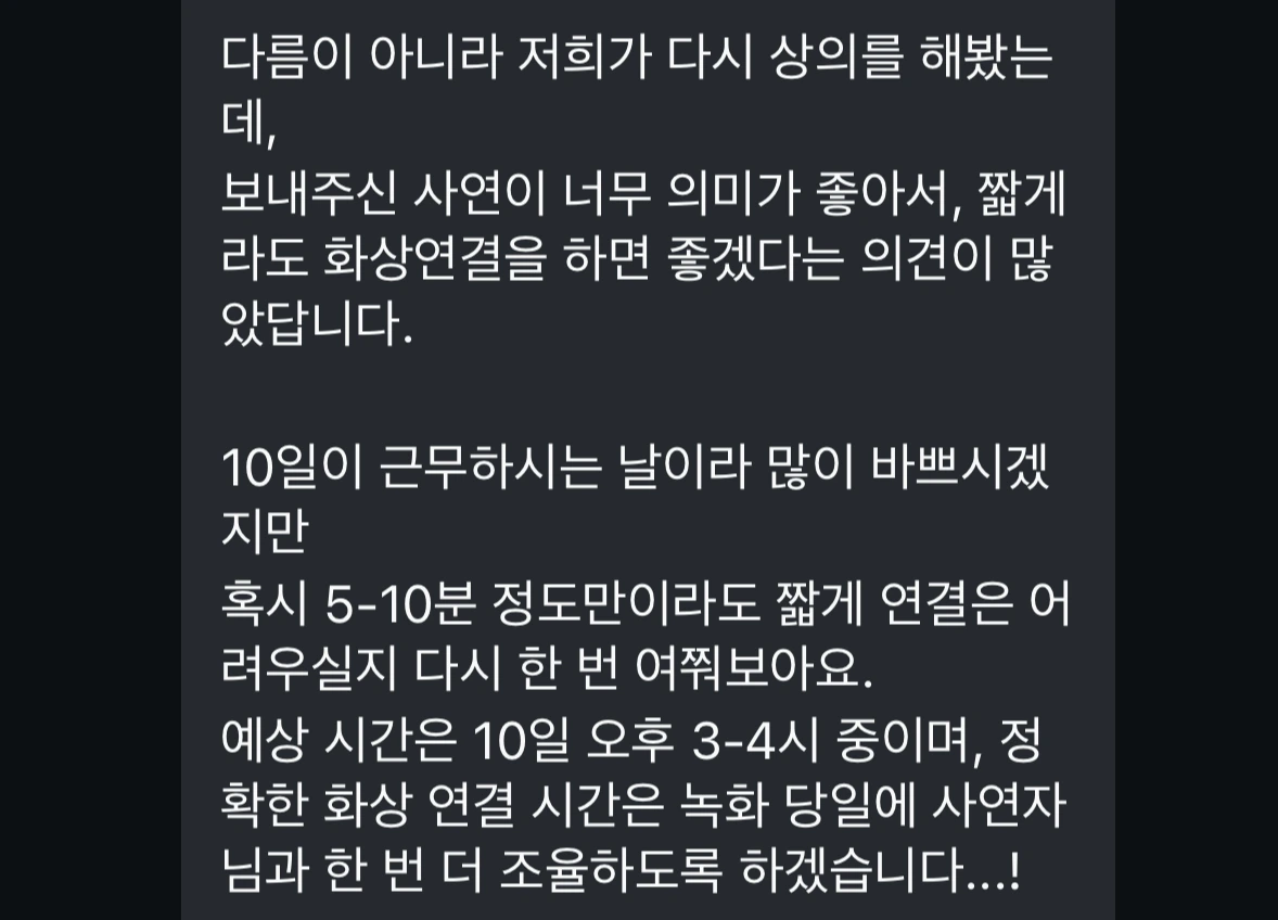 내 상황을 말씀드렸음에도 불구하고, 유튭에 소개할 내용과 내 사연의 취지가 잘 들어맞기에 인터뷰를 하고 싶다고 하셨다. 날짜, 시간을 여러 번 논의하고 수정한 끝에 인터뷰 날짜를 잡았다.