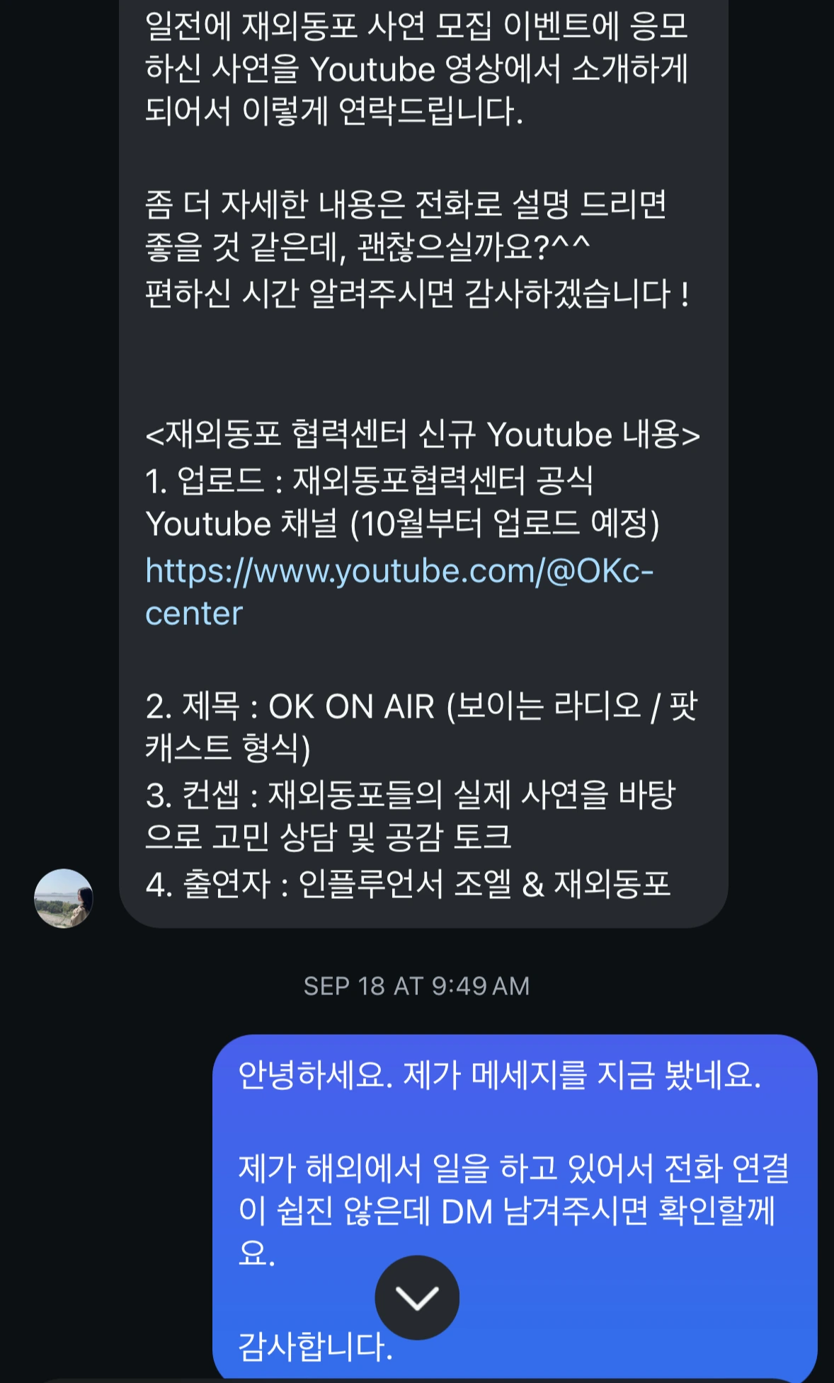 재외동포협력센터 작가님으로부터의 DM이 도착했다.