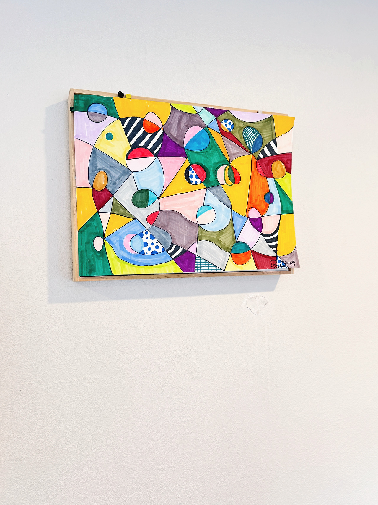 캔버스 위에 아무렇게나 그려진 선. 또 다른 선. 그 선들과 이어진 다른 선들이 모여 무늬를 그려낸다. 그렇게 자유롭게 그려진 선 들 위로 색이 하나씩 채워진다. 노란색, 파란색, 회색, 초록색, 검은색. 하얀 바탕이 다채롭게 물들어간다. 그렇게 색상만 채워지는 것이 지루했을까. 줄, 점, 체크 등의 무늬가 색상들 사이에 들어가 가만히 앉았다.