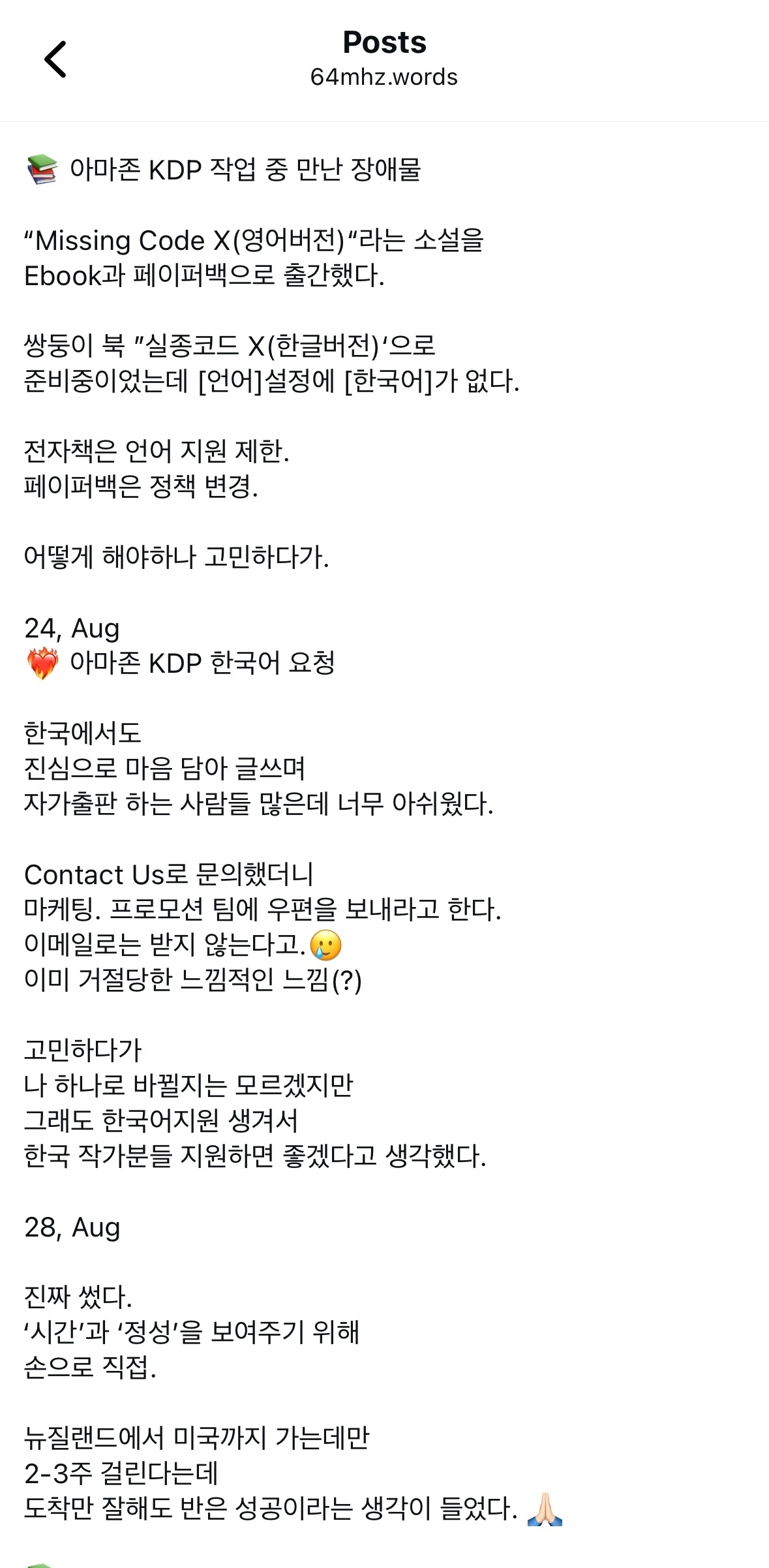 작가를 꿈꾸며 매일 글 쓰는 사람, 책을 발행해 가며 누군가에게 도움을 주려는 사람, 정보를 알려주려는 사람, 포기하지 않고 출판사의 문을 두드리는 사람 등 솔직하고, 진실되게 한글이라는 도구로 자신을 표현해 가는 사람들이 많다. 세계로 나가면 그 노력이 발돋움되어 영향력이 폭발할 수도 있을 텐데 아마존 KDP에 한글이 없다는 게 많이 아쉬웠다.