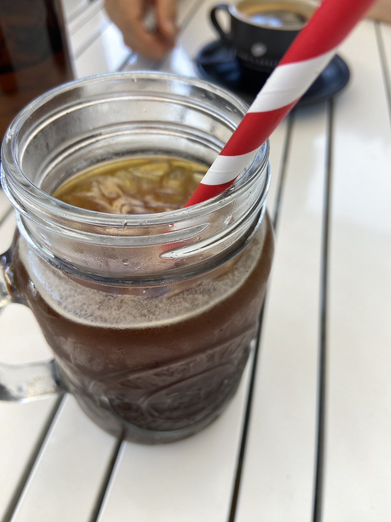 노란 줄무늬 파라솔과 테이블이 강변의 햇살과 잘 어우러진다. 야외 테이블에 앉아 잠깐 쉬기 위해 아이스커피를 주문했다.