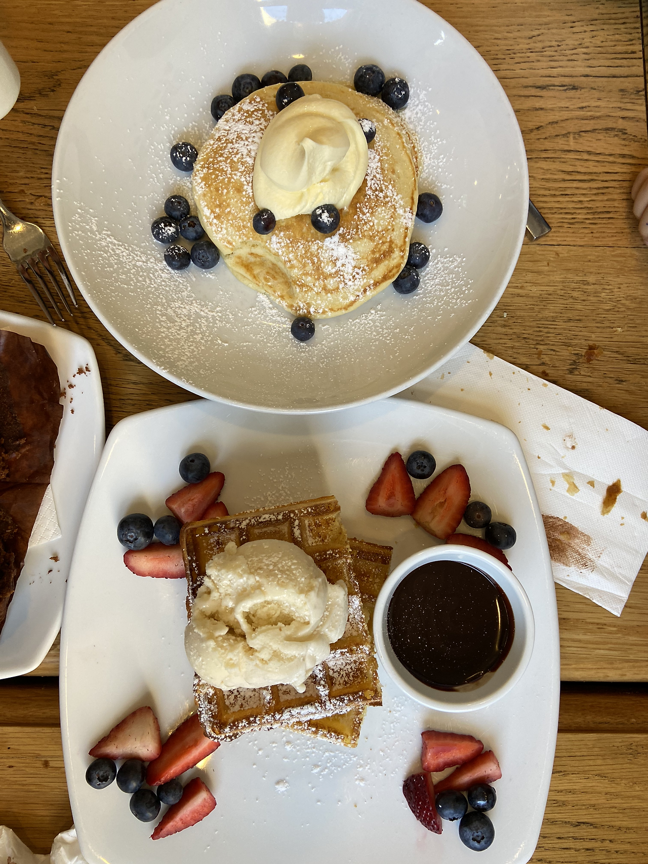 내가 주문한 것은 팬케이크와 와플 그리고 커피였다. 팬케이크는 시럽, 와플은 초콜릿과 같이 서빙됐다.