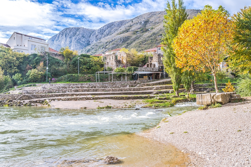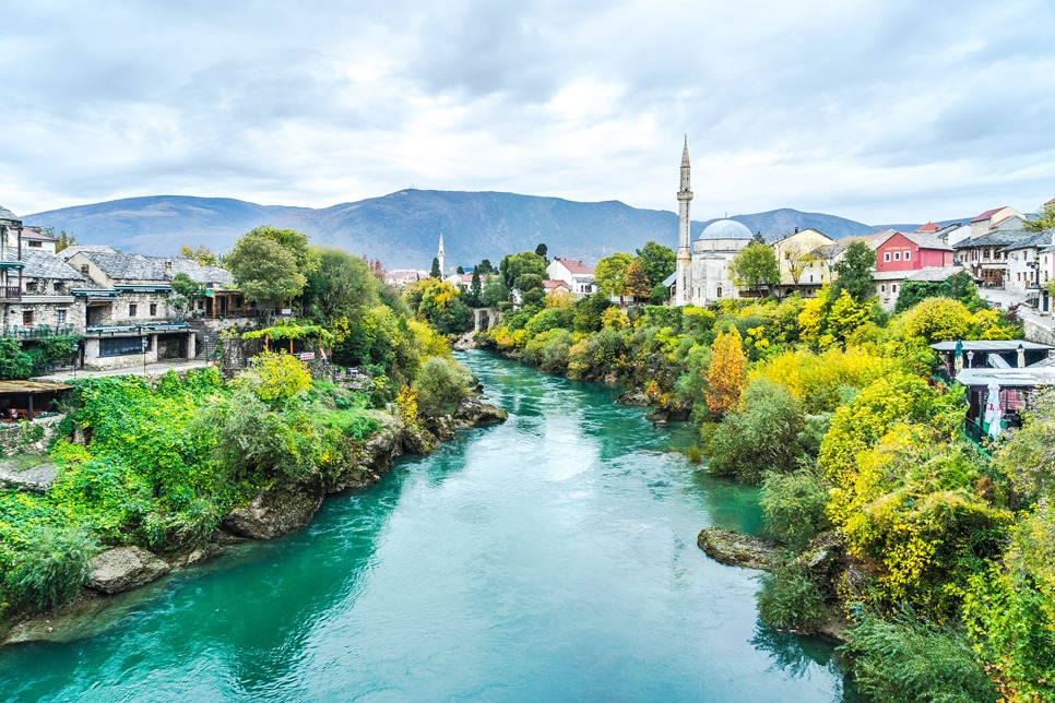 보스니아 네레트바 강의 모습, 물빛은 옥색으로 모스크와 더불어 묘한 분위기를 연출하는 것 같다. 여름 무렵 이곳을 찾으면, 오래된 다리에서 다이빙 대회도 진행한다는데, 바닥이 보이지 않는 초록색 물빛으로 뛰어드는 것에 대해 살짝 무섭게 느껴지기도 하지만, 재밌을 것 같다는 생각도 공존하는 것 같다.