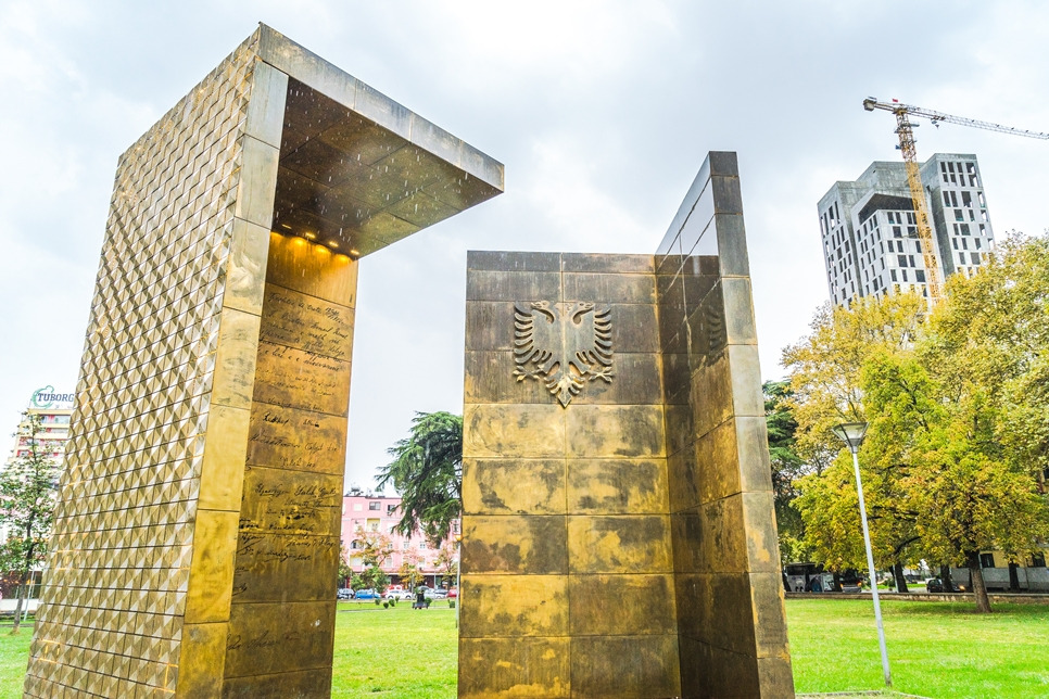 리니아 공원의 중앙에는 독특한 조형물이 있는데, 조형물에는 알바니아의 국기 문양이 각인되어 있다. 사진 속 문양은 독수리로 독수리의 2개 머리는 이 나라가 동양과 서양 사이에 위치하고 있음을 나타낸다고 한다. 국기의 문양은 스칸데르베그의 생가인 카스트리오타가의 깃발에서 유래되었다고 한다.