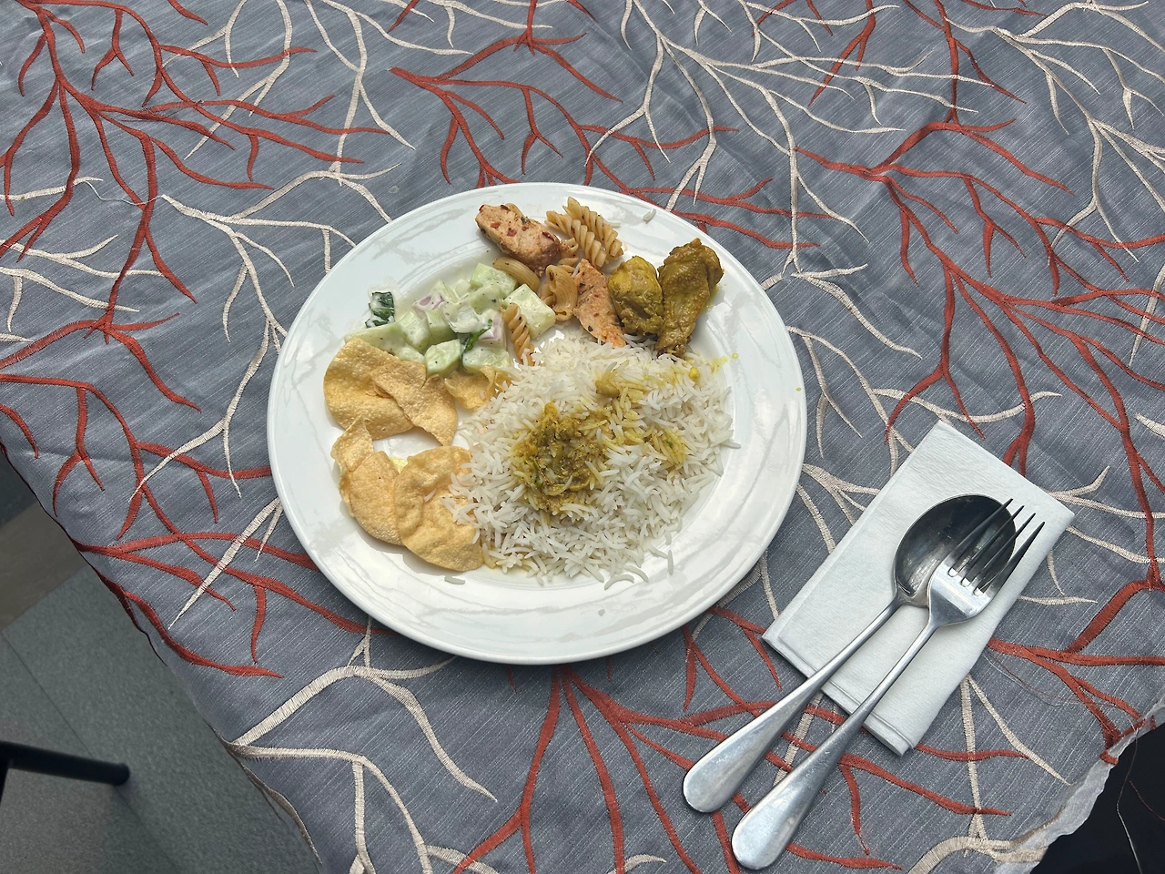 발표가 너무 길어져서 중간에 인턴들은 조금 일찍 나와서 점심 식사를 시작했다. 점심 직후에 주 총리께서 참석하실 계획이어서, 더더욱이 식사 시간이 쫓길 것이라고 예상되어서 직원분들이 먼저 식당으로 보내주셨다. 2일 차 점심은 전날과 다르게 정말 만족스럽게 먹었다. 특히, 파니르 카레 (Paneer Curry)와 생선 강정 볶음 요리가 우리 입맛에도 너무 잘 맞는, 내가 기억하는 맛들 과 일치하는 맛이라서 이날은 거의 세 접시를 먹었다. 오랜만에 완전히 배가 부를 정도로 먹은 것 같다. 밥을 먹으면서 다른 인턴들과 국가별 학교 교육 방식에 관한 이야기도 하고, 일부 인턴들은 주말에 등산을 가고자 해서 그에 대한 계획도 세웠다. 정말 순식간에 우리의 점심시간이 지나갔고, 거의 다 먹어갈 때쯤 다른 공무원분들이 우르르 나오셨다.