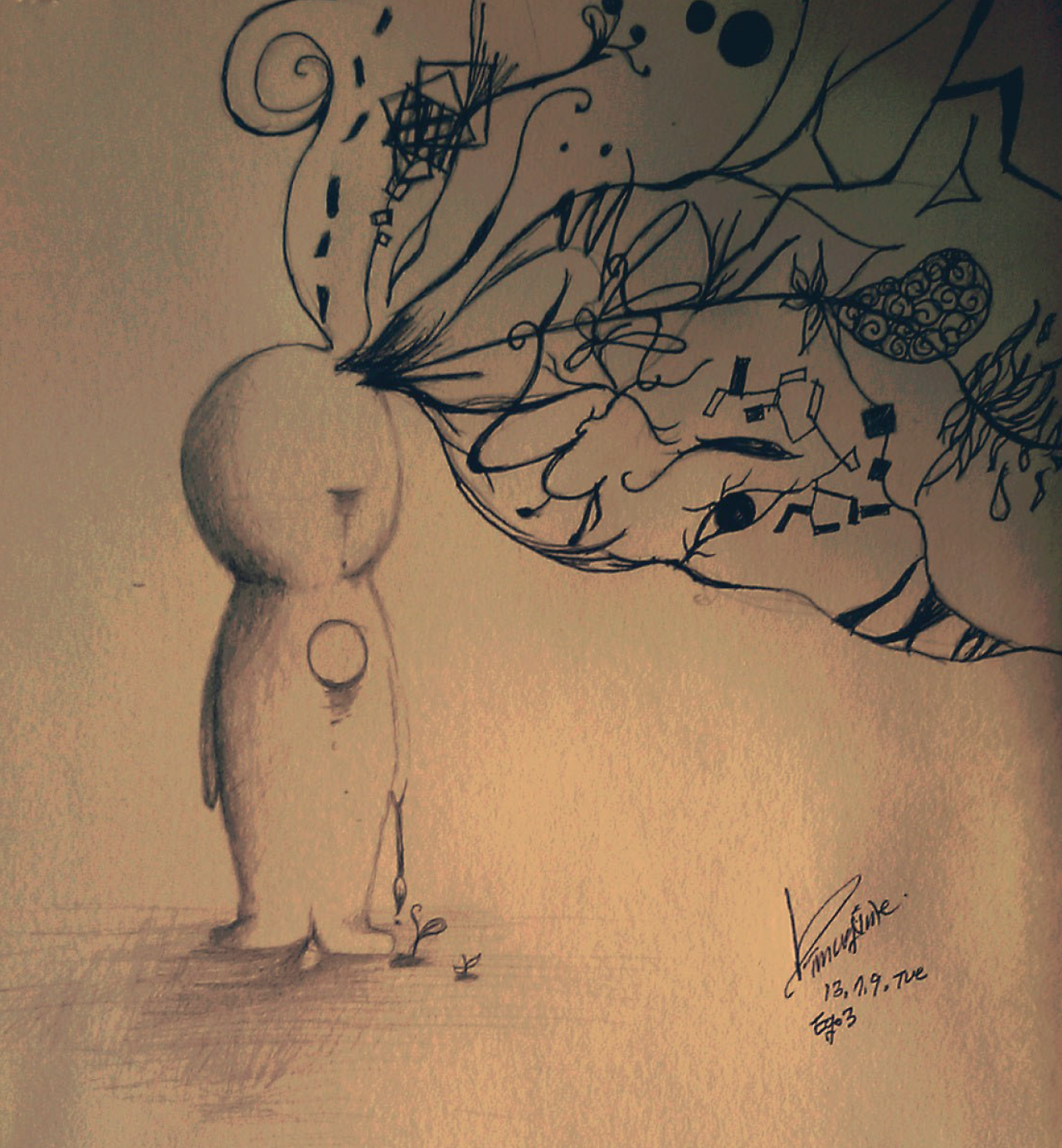 아이는 빨간 가로 줄무늬가 새긴 노란 옷차림이었는데 얼굴 이목구비는 비어있고, 밀랍인형처럼 굳은 팔은 양쪽으로 뻗어 빳빳이 움직이지 않았다. 아이는 허수아비와도 흡사했다.