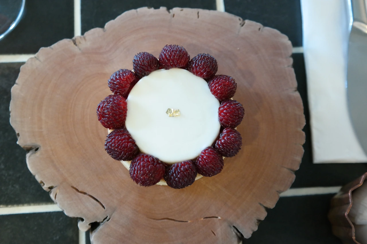 하얀 바탕에 빨간 산딸기와 장미잎, 식용 금박으로 장식된 화이트 초콜릿 돔.