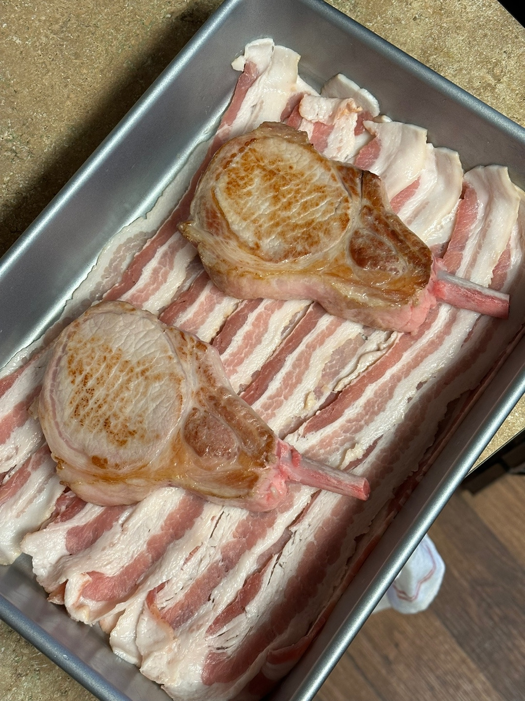 부대찌개를 두 번을 끓여도 베이컨이 남아서 처치하기 곤란했는데, 또 마침 사놓고 먹기가 애매해서 놔둔 돈마호크가 있었다. 게다가 사촌처제네 집에는 오븐이 있었고 결국 베이컨을 두 줄로 깔아둔 다음에 돈마호크를 구웠다. 돈마호크는 팬에 가볍게 겉면을 익혀준 후, 450℉(232℃)로 오븐을 예열해둔 다음에 적당히 잘 익히면 된다. 나는 베이컨이 바삭해지고 기름이 쫙 빠질때까지 익혀줬다. 돈마호크에는 아무 양념도 하지 않아 보쌈같은 질감으로 완성이 되었고, 취향에 맞춰 베이컨칩을 곁들여 먹었다. 마치 스테이크 모양의 보쌈마냥, 바삭한 과자같은 베이컨까지 곁들이니 결국 우리는 맥주를 먹지 않을 수 없었다.
