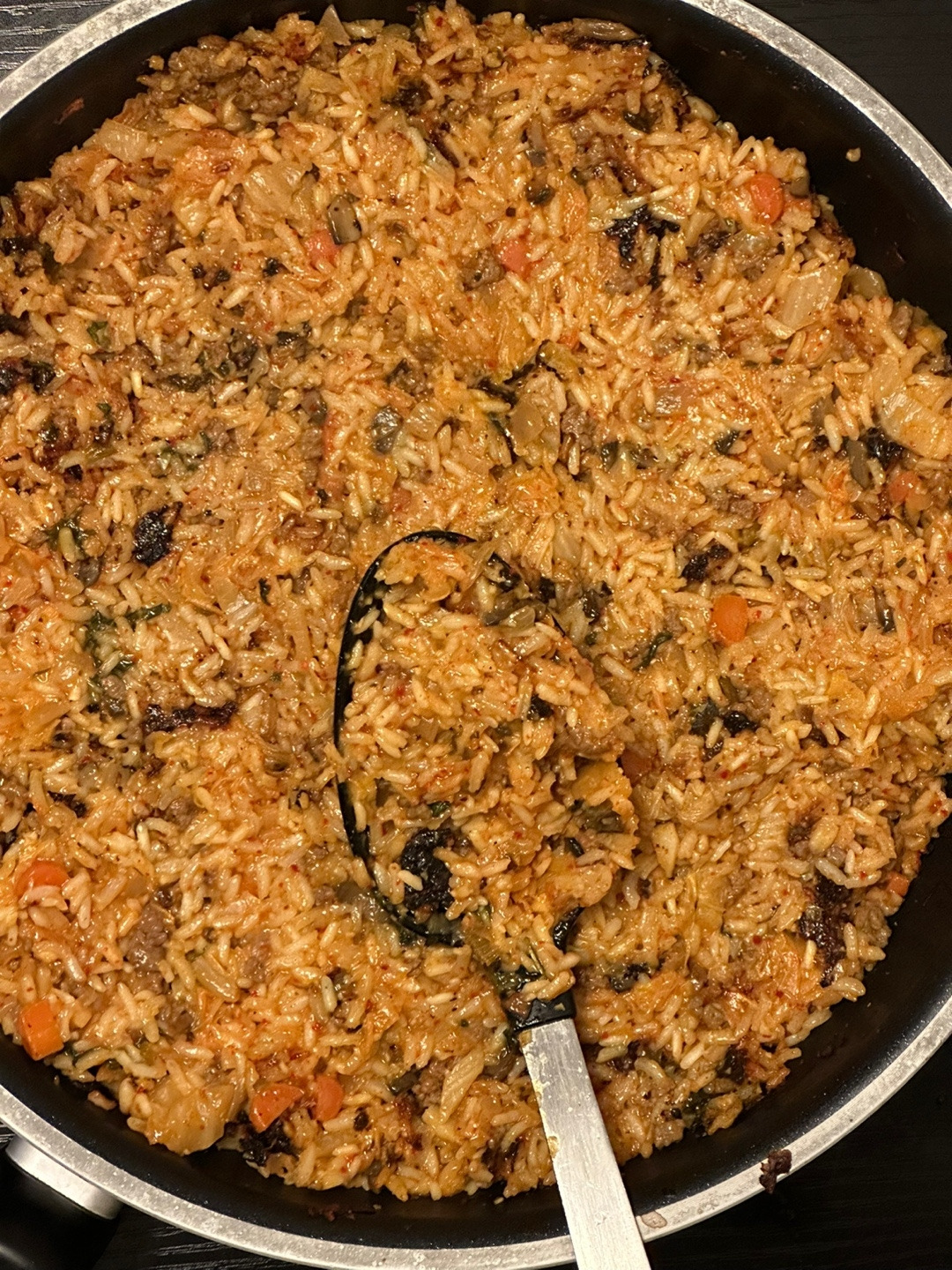 김치빠에야는 원래 김치볶음밥을 하려다가, 사촌처제네 묵은 자스민쌀이 있길래 시도해본 요리다. 부대찌개 국물과 남은 김치를 썰어서 육수를 만들고, 자스민 라이스와 잘 섞어서 약불에 서서히 그을리듯 익히며 3층밥을 완성했다. 남은 베이컨과 소세지가 있었기에 추가적으로 토핑을 넣었고, 김치볶음밥 맛이 나는 빠에야를 만들고 싶었으나 그냥 3층밥이 잘 표현된 김치맛 빠에야로 끝나버렸다. 살짝 아쉬운 요리 중 하나. 그냥 냄비밥이라도 가볍게 지은 다음에 볶음밥을 할걸 그랬지.