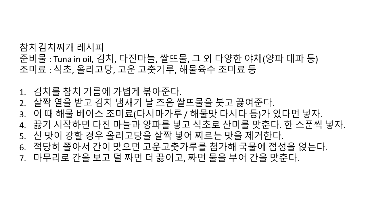 식당 김치찌개맛을 내는 가장 중요한 조미료는 식초다. 보통 사람들이 묵은지가 없는 상태에서도 시큼칼칼한 김치찌개를 원하는데, 이럴때 도움을 주는 일등공신이 식초다. 그냥 적당한 맛김치 정도만 넣어서 김치국물 흉내를 내면, 식초를 넣고 날카롭게 찌르는 식초맛을 중화시키기 위해 설탕이나 올리고당을 살짝 첨가한다. 기본간은 당연히 김칫국물로 맞추지만, 다 알면서도 모른척 먹는 수준으로 식초를 넣고 그의 공격성을 일부 상쇄시키기 위해 올리고당을 넣는다. 이후 끓이면서 미량의 간장과 넣어주는 고기/생선 종류에 맞춰 감칠맛 양념을 첨가해주면 끝이다. 식초는 정말, 넣고 안넣고에 따라서 김치찌개 맛이 확 달라지니 무조건 추천한다. 미국에도 있잖아요, Vinegar. 역시 위의 레시피와 마찬가지로 간단하게 적어서 아래 이미지로 공유한다.