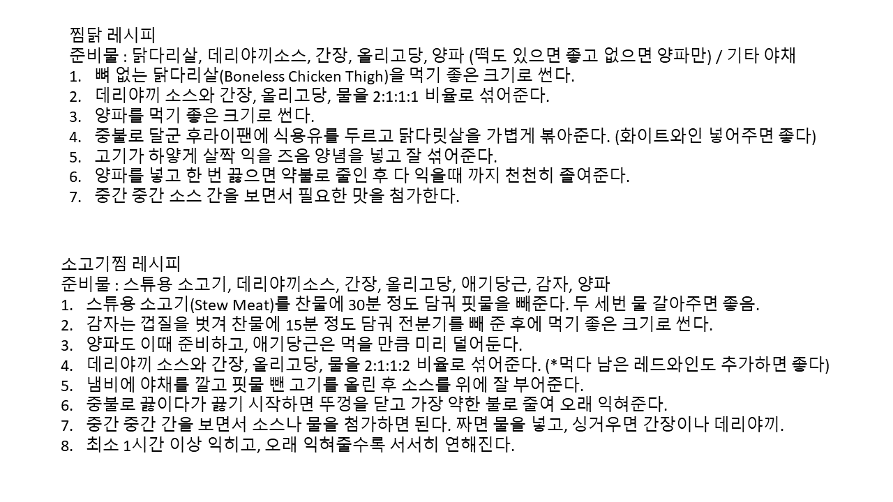 소갈비찜도 굳이 뼈가 붙은 고기를 살 필요도 없다. 말이 소갈비찜이지, 제대로 소갈비찜 하려면 냄비부터 양념까지 쉬운 일이 아니다. 양념만 소갈비 양념을 하고, 고기는 스튜용 고기를 사서 끓이면 두 시간 안에 그럴싸한 갈비찜을 먹을 수 있다. 쉽게 말하면 비프스튜를 끓이는데 그 맛을 갈비찜 양념을 하면 된다고 생각하면 좋다. 또한 당근도 큰 당근을 썰어서 할 필요 없이, 미국 마트라면 무조건 있는 베이비 캐럿을 넣어주면 정말 좋다. 식감도 살아있고, 당근에서 배어 나오는 단맛이 풍미를 끌어올려준다. 이 요리들에서 가장 구하기 어려운건 찜닭용 떡이다. 혹시 떡을 구하지 못한다면 빵을 찍어 먹어도 꽤 괜찮긴 하다. 브런치에서 글로 레시피를 적어두면 읽으면서 요리하기 어려울 수 있어서, 직접 작성한 이미지 파일을 첨부한다. 태블릿이나 스마트폰의 가로화면 모드로 보면서 참고하면 좋다.