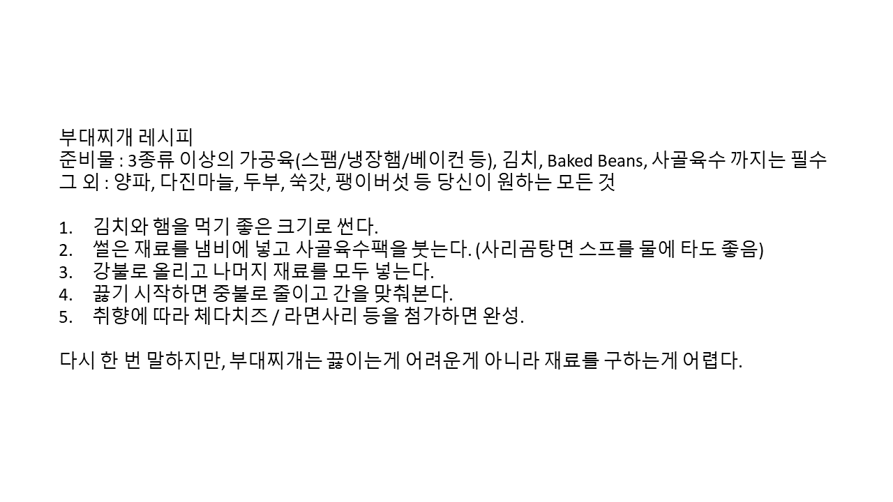 기타 쑥갓이나 팽이버섯 두부 등은 뭐, 마트에 갔는데 있으면 넣어보고 아니면 패스해도 좋다. 부대찌개에서 가장 중요한 재료 3대장은 푸짐한 가공육/김치/베이크드빈즈다. 이 세 가지만 넣고 보글보글 끓이면 얼추 간이 맞는다.
