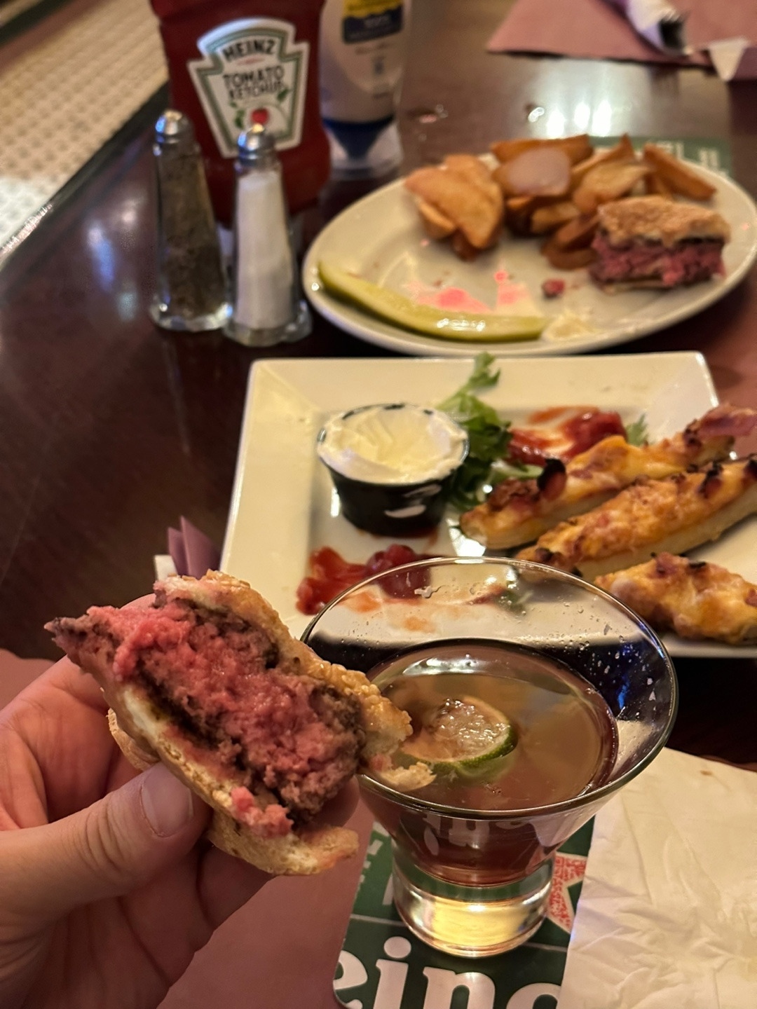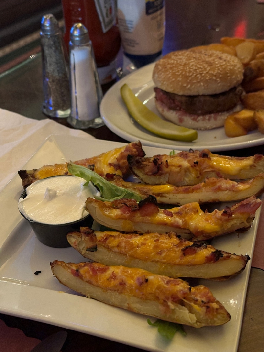 구운 감자 껍질과 맥클래런 고기 버거. 고기버거는 말 그대로 고기빵이었으며, 감자 껍질이 붙은 포테이토스킨은 생각 이상으로 맛있었다. Irish Pub이라 그런가, 감자요리에 조예가 깊은듯 하다. 이 곳의 일부 푸드 메뉴들과 칵테일들은 모두 하우멧의 에피소드에서 따온 이름들이 많다. Potato Skins도 극중에서 Ted가 무언가에 빗대어 표현했던 단어인데, 미리 말하자면 버거보다 감자껍질이 더 맛있었다. 버거는 보이는 그대로의 맛(미디엄 레어의 함박스테이크를 빵으로 잡아서 먹는 맛)이지만, 포테이토 스킨은 정말 미국에서 먹은 감자 요리 중 가장 맛있었다. 잘 구워진 감자 껍질의 거칠면서도 바삭한 식감과 수분기가 날아가 포슬포슬하면서도 뻑뻑한 감자 위에 얹어진 베이컨과 치즈의 풍미는. 다시 가면 인당 하나씩 시켜 먹어도 부족함이 없다.