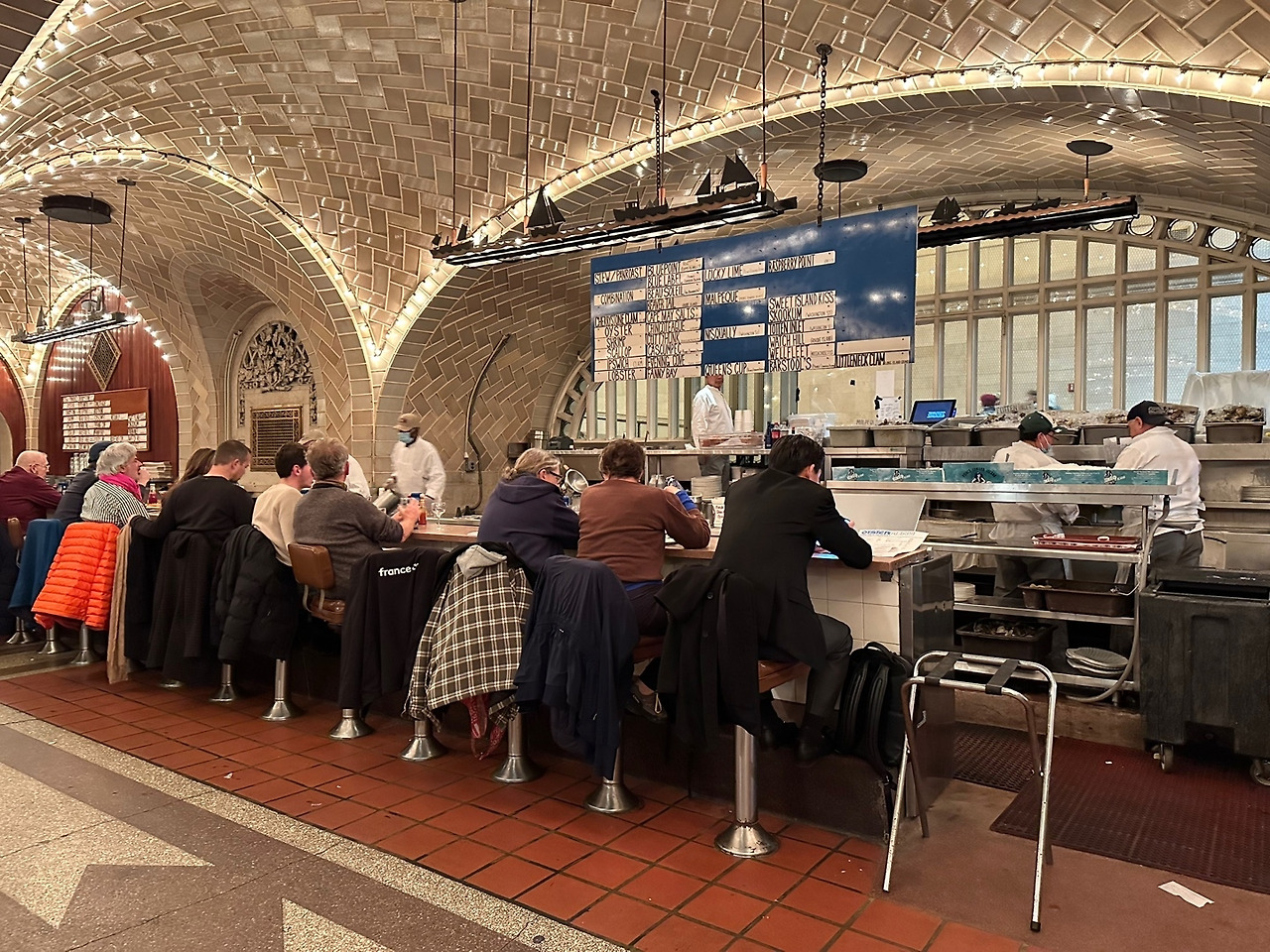 이곳이 바로 Grand Central Oyster Bar. 어쩐지 입구부터 설렜다. 형형색색 수놓아진 OYSTER 글씨 하며, 그보다 위에 아치형 입구에 쓰여진 OYSTER BAR RESTAURANT라는 글씨까지. 누가 봐도 오랜 맛집처럼 보였기 때문이다. 터미널 한복판에 이런 바가 있다는게 반가웠다. 우리나라로 따지면 강남 고속터미널에서 회에 소주 한 잔 마시고 버스타는 느낌이랄까.