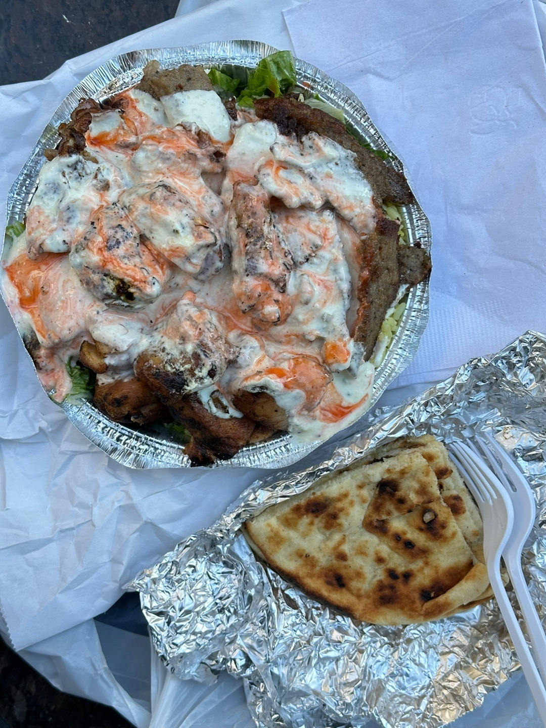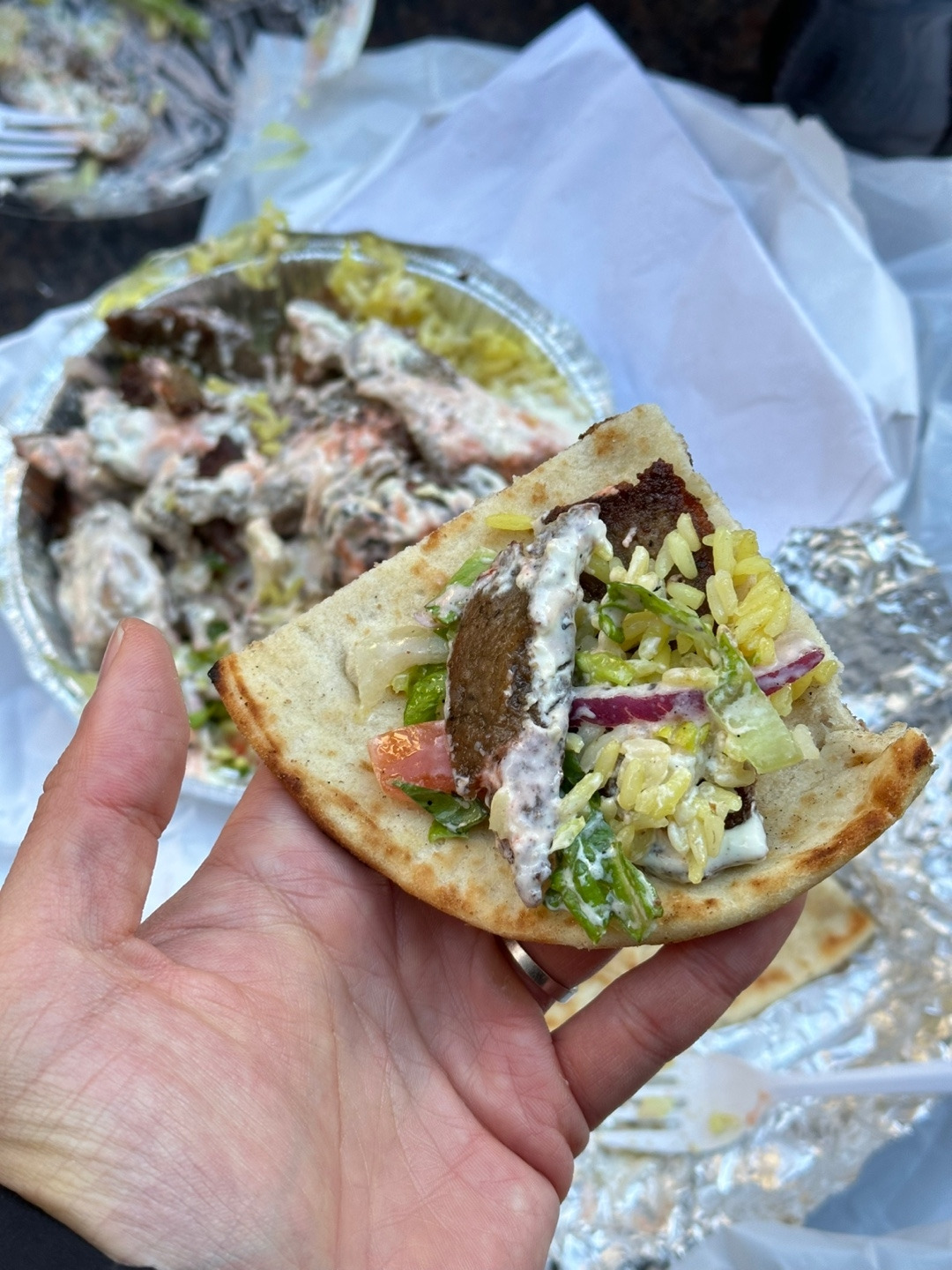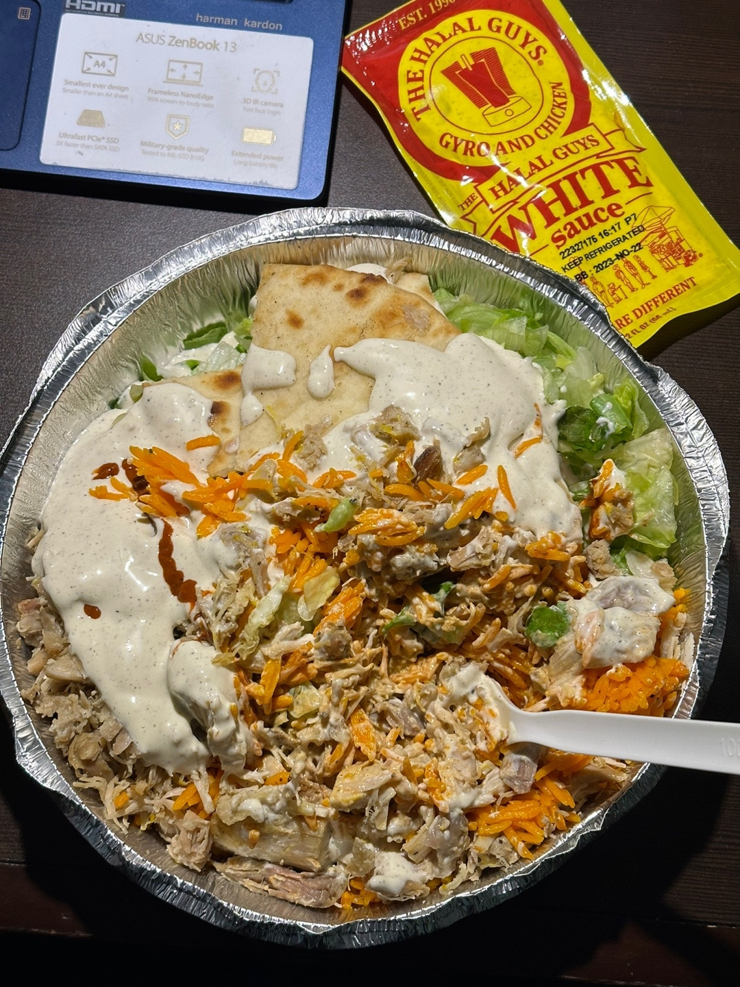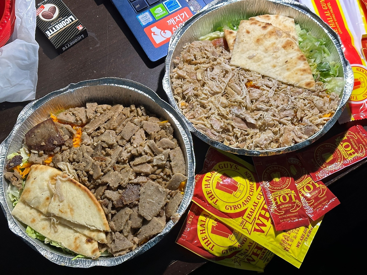 일단 할랄 카트 푸드들에 대해 잠깐 짚고 넘어가자면, 양념된 밥 위에 선택한 고기를 얹고 야채와 난 등을 섞어주는 일종의 샐러드 보울이라고 생각하면 편하다. 고기는 대체로 양고기와 닭고기가 많다. 섞어서 믹스로 시켜도 상관없다. 옛날에 먹을때는 소스통이 카트 옆에 있어서 자유롭게 뿌려먹곤 했는데, 요즘은 포장 요청하니 낱개 포장된 소스를 잔뜩 줬다. 화이트 소스 하나에 핫소스 하나를 뿌리는게 일반적인 레시피지만, 할랄가이즈 핫소스는 정말 너무너무 맵기 때문에 심사숙고해서 도전하길 추천한다. 예전에 먹을때 일반 타바스코 생각해서 저걸 접시의 반을 둘렀더니 먹다가 기절할 뻔 했다.