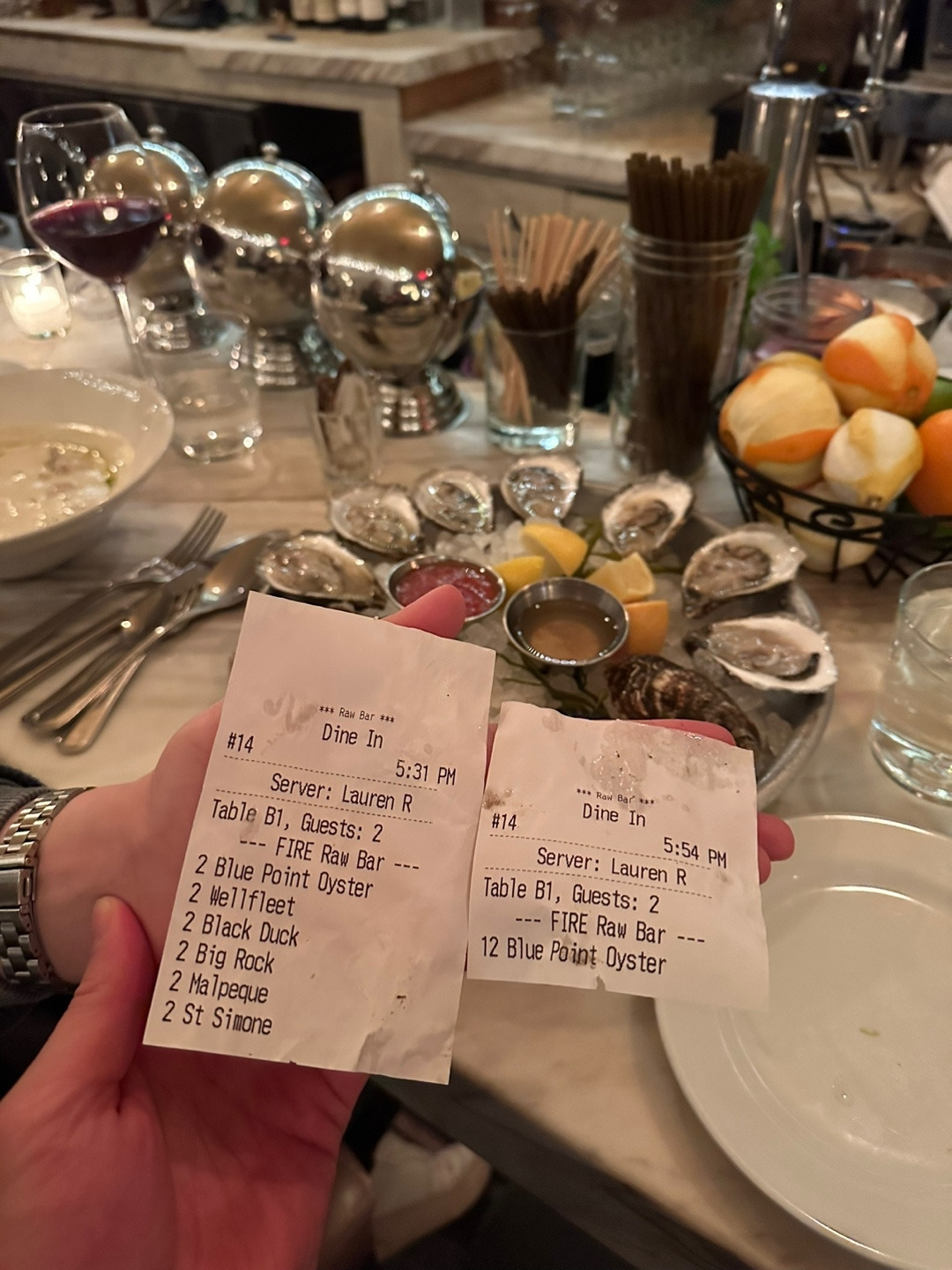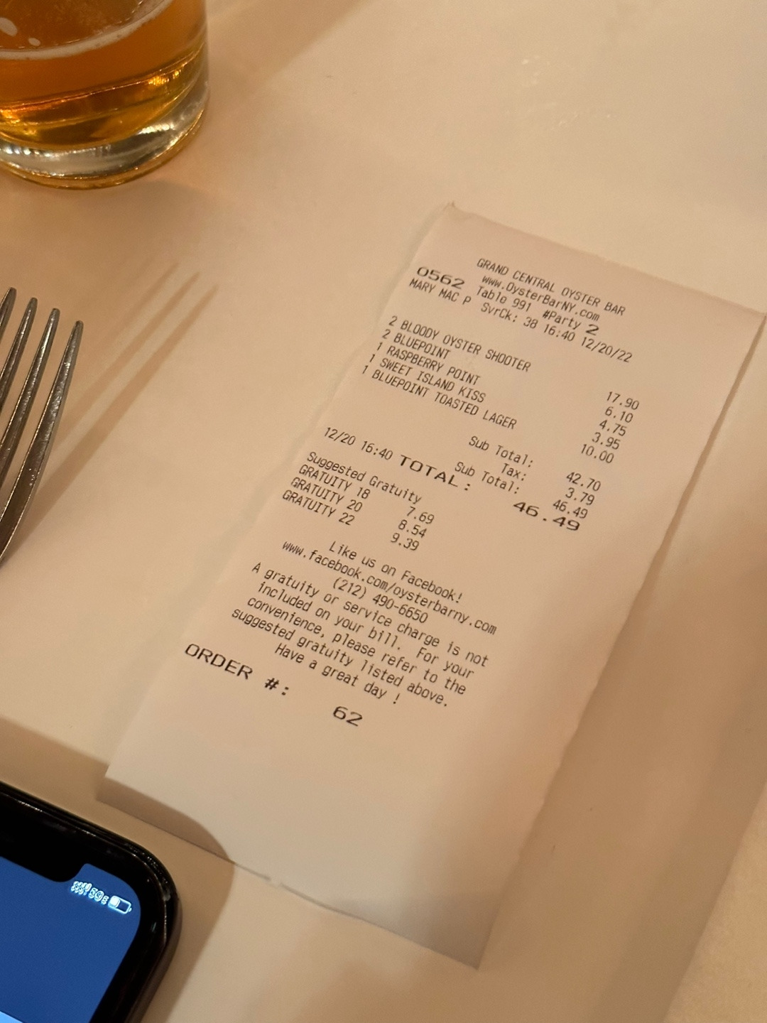 우리는 결국 30분 만에 굴 24개와 오이스터 피클백 네 잔, 크림 스프와 몇몇 칵테일을 마셨다. 워낙 맛있게 취해서 영수증도 제대로 담지 못한게 아쉽다. 뭐 아무렴 어떠랴. 아내가 뉴욕에 출장 왔던 기억 덕분에 잊을 수 없는 추억을 쌓고 돌아왔으면 그걸로 족하다. 만약 당신이 뉴욕에서 오이스터바 경험을 한다면, 이 곳의 해피아워 시간에 방문해서 종류별로 모두 맛을 본 후, 가장 맛있다고 생각하는 굴로 한 접시를 더 먹으면 딱 좋을듯 하다.