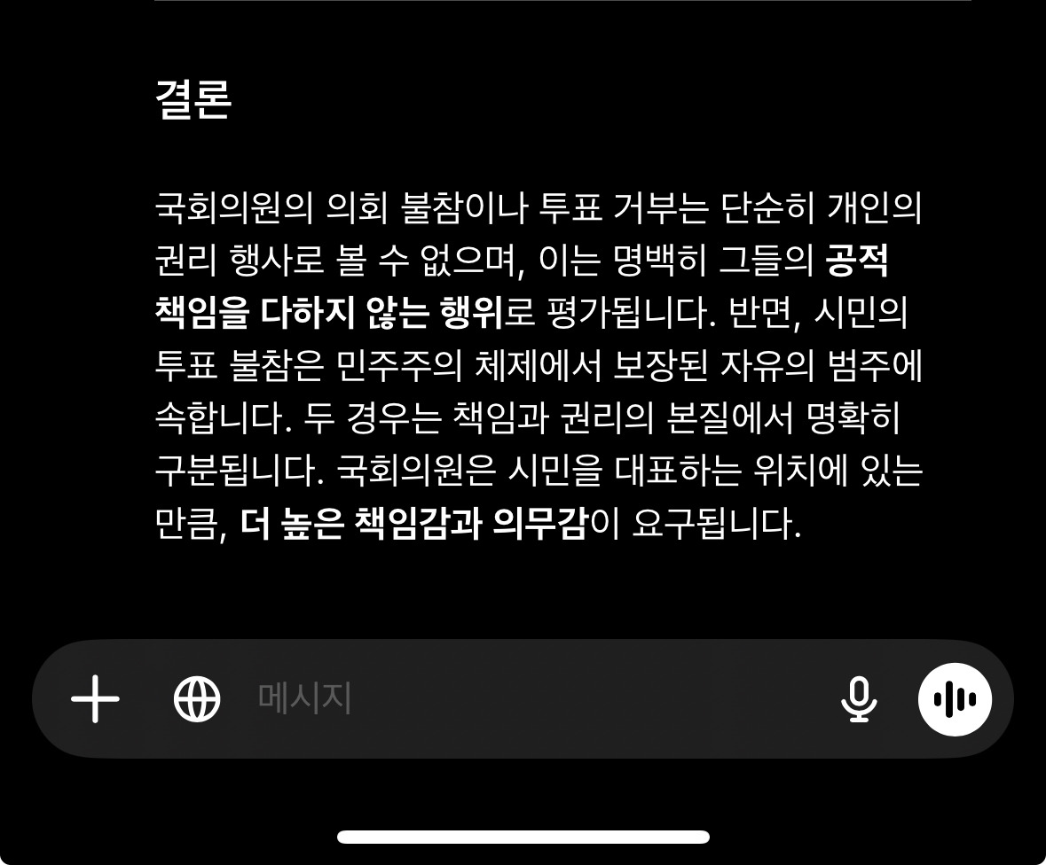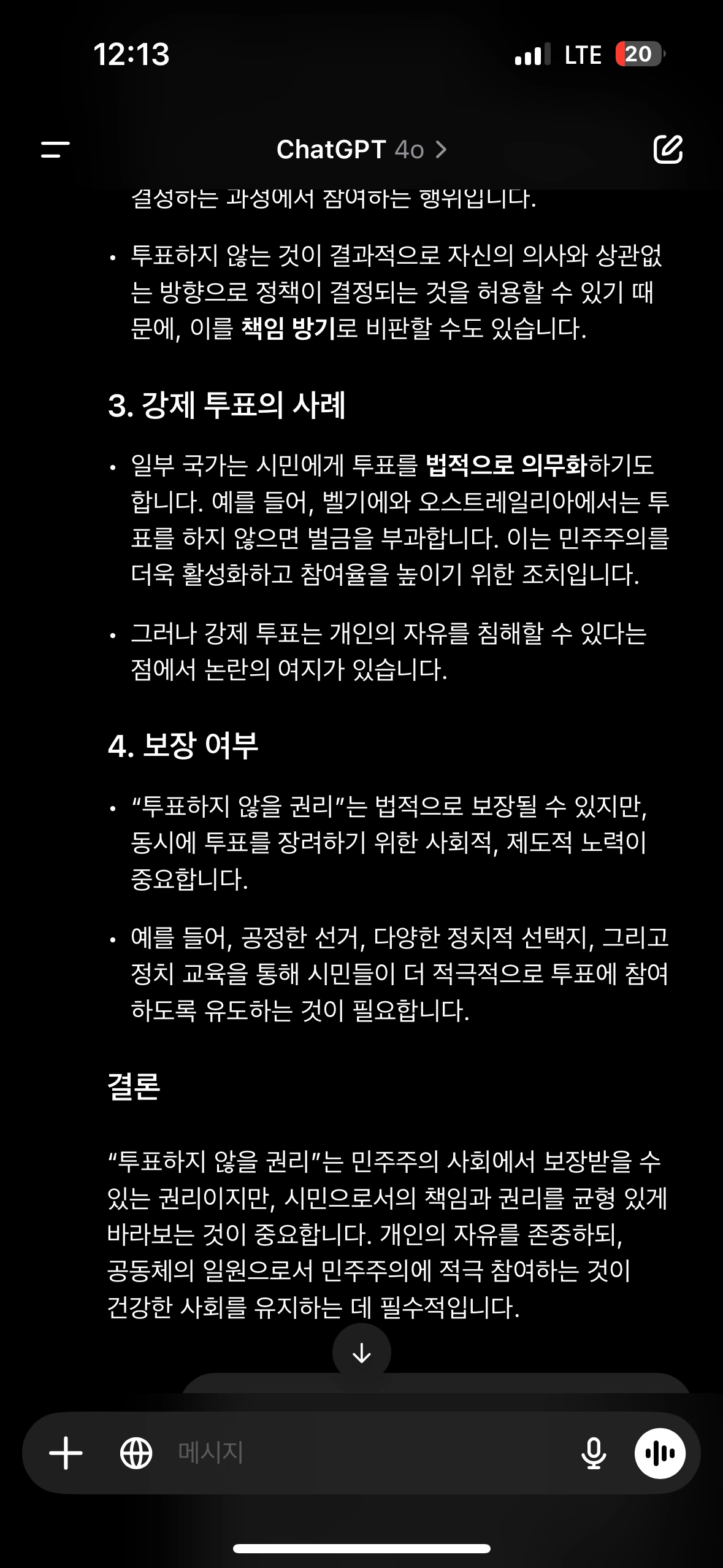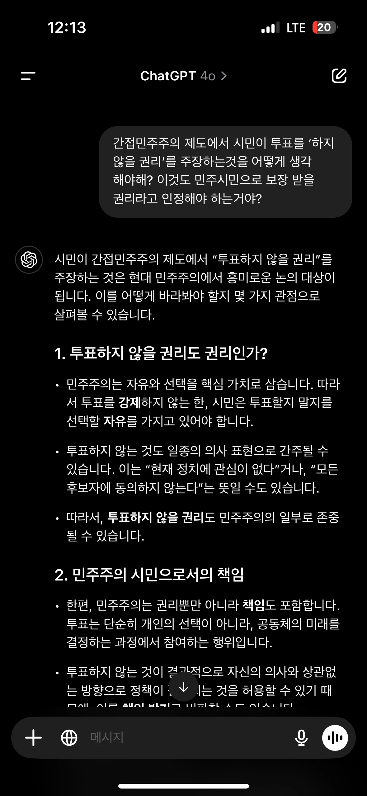 - 우선 일반 시민의 경우 투표에 참여하지 않을 자유가 있는지 논의하였다. ChatGPT의 결론은 다음과 같았다.