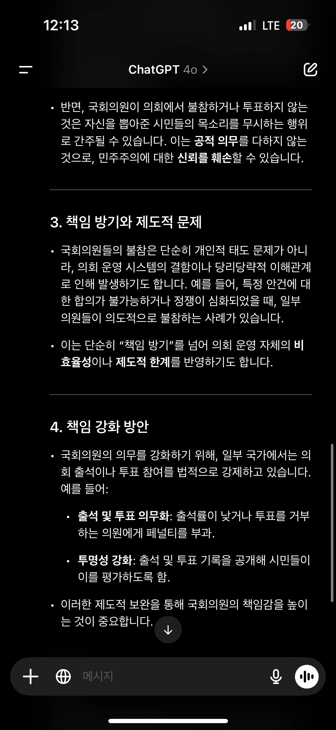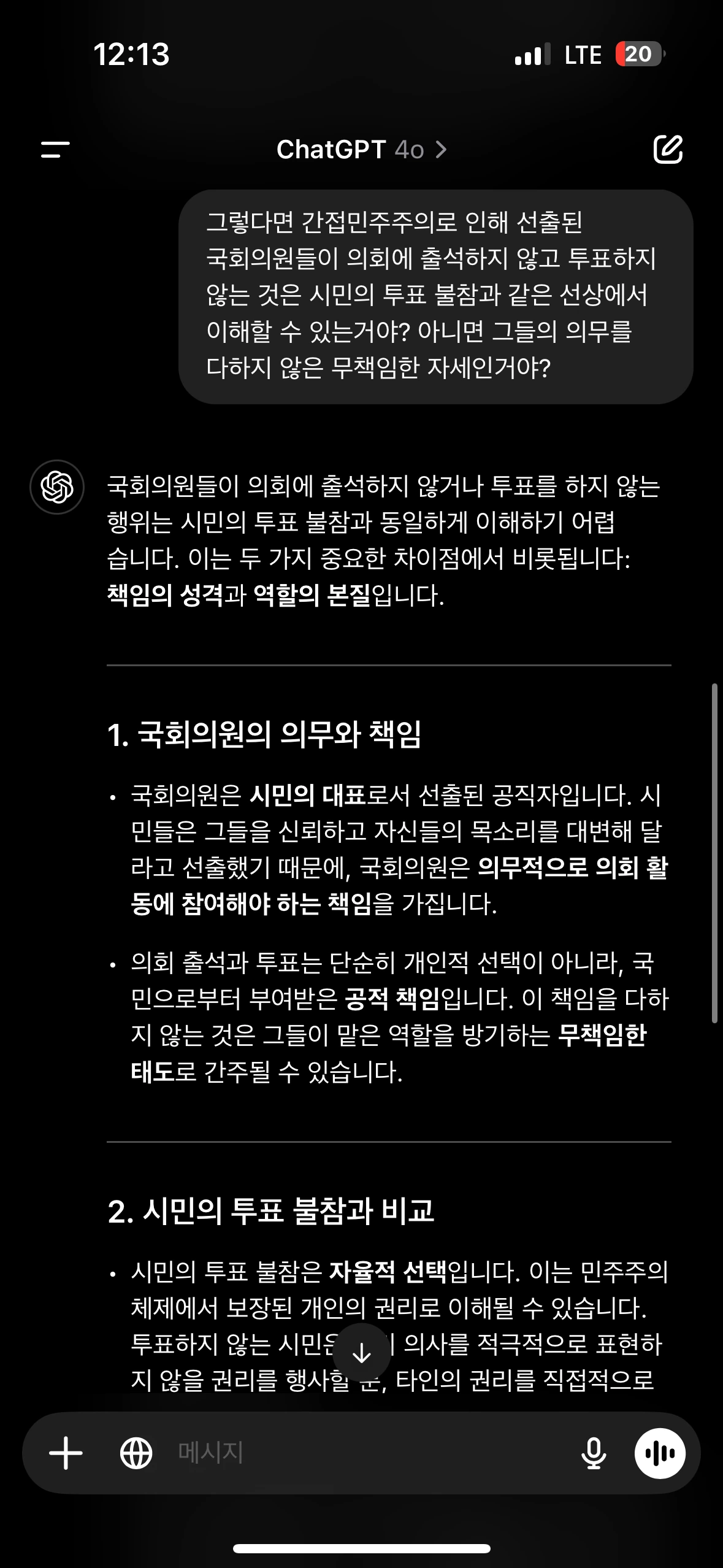 - 국회의원은 선출직으로, 전국의 시민들이 총선을 거쳐 소중한 한 표를 통해 뽑아주는 대표시민의 역할이다. 5천만 국민이 모든 사안에 대해 직접 참여할 수 없기에, 이들을 대신 할 대표시민 300인을 뽑아 우리 대신 의견을 내는 집단이다. 이는 직접 선거에 의한 간접민주주의로서, 모든 국회의원은 자신들을 믿고 뽑아준 시민들의 의견을 표출할 의무가 있다. 그럼에도 불구하고 윤석열의 탄핵소추안 첫 투표는 이러한 의무를 저버린 여당 의원 105인에 의해 투표 자체가 성립되지 못했다. 이에 보다 구체적인 의무와 권리를 찾아보고자 ChatGPT와 함께 담론을 나누었다.