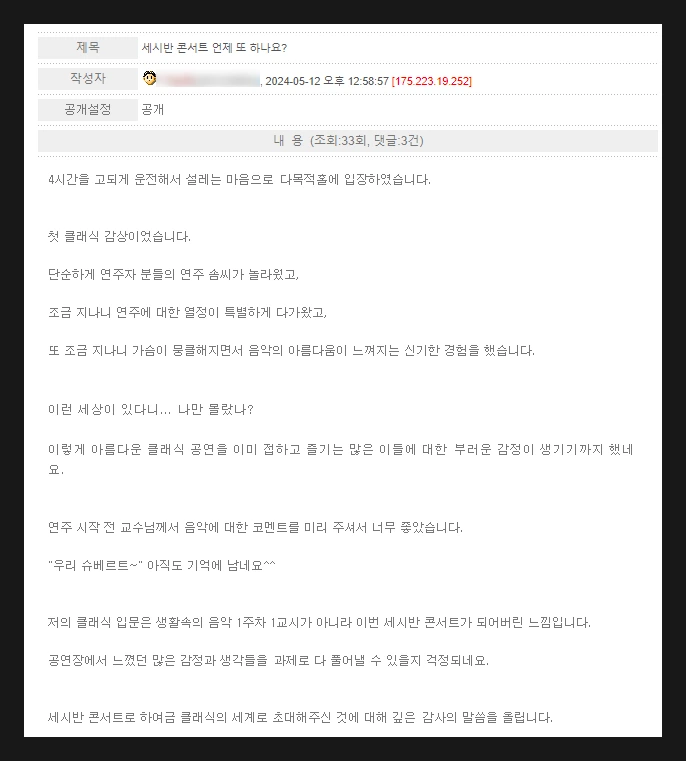 정말 힘들었지만 '쉽게 준비하고 기대가 컸던 연주는 오히려 별로였던' 내 지난 경험(들)을 유일한 희망으로 삼으면서 어쨌든 이번 공연을 마칠 때까지 내가 할 수 있는 노력은 끝까지 다 해보자고 생각하며 버텼다. 연주가 부족하면 스피치로라도 메꿔야 될 것 같아서 관객들에게 내 진심을 전할 수 있도록 어떤 이야기를 할까에 대해서도 고민을 많이 했다. 아무튼 지금까지 일곱 번이나 세시반 콘서트를 하던 중에 가장 걱정이 많았었고 그만큼 제일 치열하게 준비했었던 것 같다.