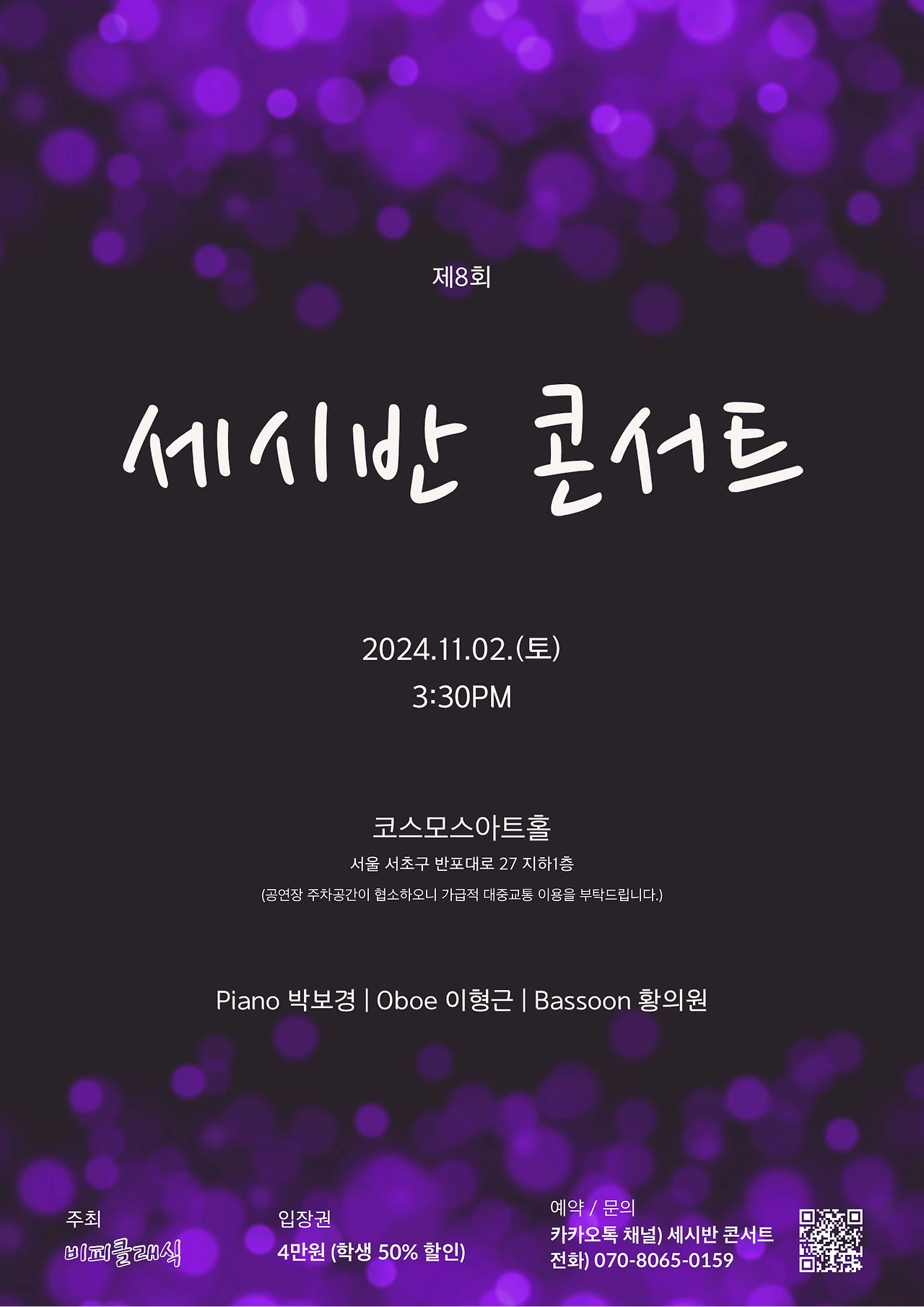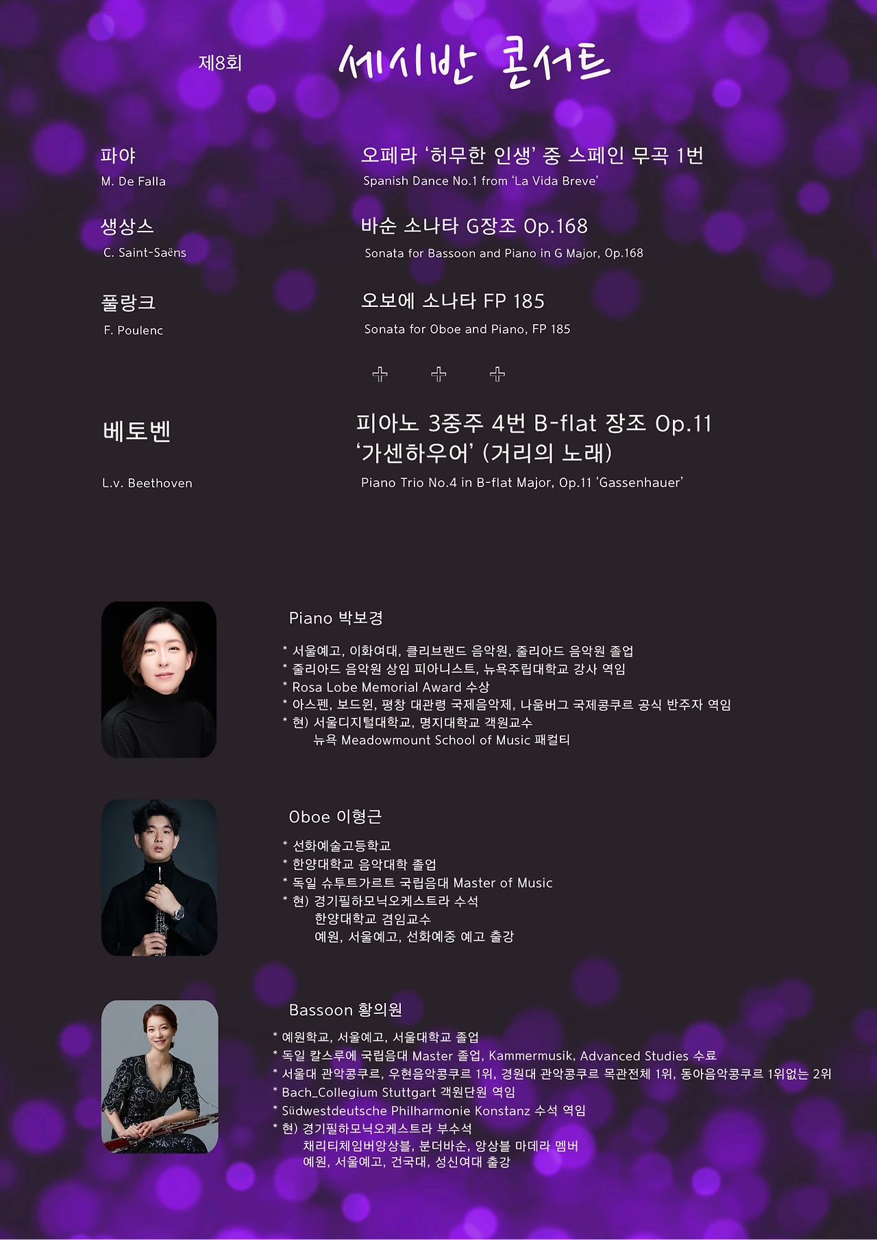 저는 다음 달에 세시반 콘서트를 준비하고 있어요. 세시반 콘서트도 벌써 8회째를 맞게 되네요. 그동안은 피아노와 현악기의 실내악을 소개 드렸었는데 이번에는 처음으로 목관악기와 함께하는 프로그램으로 준비했습니다. 오보에와 바순, 정말 아름다운 음색을 지닌 악기들인데 오케스트라 밖에서는 들을 기회가 흔치 않죠. 귀한 기회로 좋은 연주자분들을 모시게 되어서 이번에 특별한 시간을 만들 수 있을 것 같아요. 오셔서 목관악기의 매력을 함께 느껴보시면 좋겠습니다 ^^