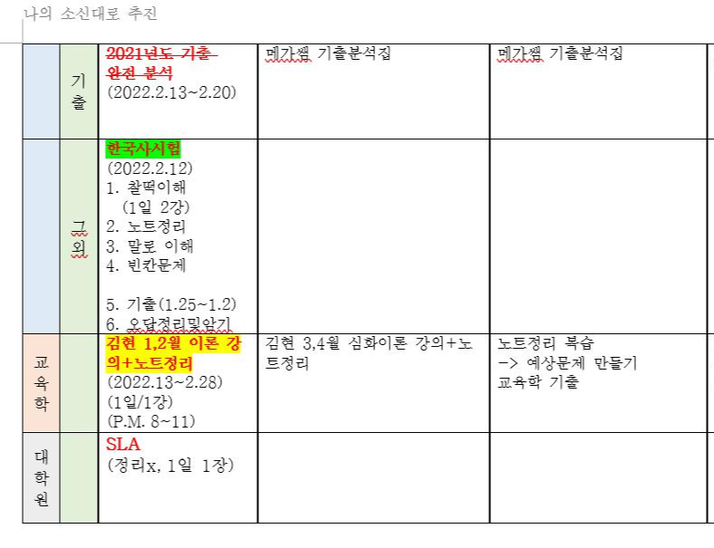 나는 H에게 계획표에 공부할 챕터 숫자만 쓰지 말고 해당 제목이나 내용을 쓰라고 했다. 예를 들어, 어제 3~4강을 공부한 후, 5~6강의 내용을 잠깐 훑어 보며 스케줄 표에 5~6강의 주요 내용을 써주는 것이다. "1. 고대 사회: 삼국시대, 통일신라시대, 2. 고대 경제: 토지, 조세, 무역" 이 정도는 써줬어야 한다. 여기에 한 번쯤은 들어봤던 청해진, 장보고, 골품제도 등등 관련된 키워드를 스케줄 표에 써둔다. 역사 시간에 아무리 졸았다 해도 장보고가 바다에서 활약한 것은 다들 안다. H에게도 고대사회, 삼국시대, 골품제와 같은 말이 전대미문 난생처음 듣는 말은 아닐 것이다. 5~6강은 책의 저자가 구분한 챕터일 뿐 한국사 시험에 합격하는데 그다지 중요한 정보가 아니다. 내일 이 시간에 무슨 내용을 공부할 것인지를 나에게 미리 알려주고 그게 그렇게 어려운 것은 아니라고, 나도 그동안 부어둔 적금 좀 있으니 찾아 쓰면 된다고 안심시켜 주는 것이 더 중요하다. 그러면 점심 먹고 바로 한국사 책을 펴 들 수 있다.