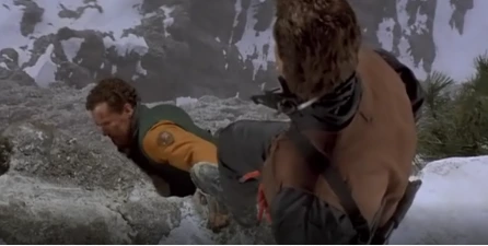 스탤론의 산악구조대 동료 마이클 루커가 절벽에 매달린 모습. 이 장면이 바로 '클리프행어'다