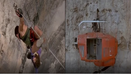 <클리프행어>의 시작과 끝. 시작할 때는 사람이 떨어지고, 끝날 때는 헬리콥터가 떨어진다