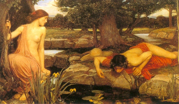 조나단 높은 콧대로 님프나 처녀들이 조낸 대시하지만 도도한 콧대로 튕김 질 하다가 호수에 비친 자신의 모습을 보고 사랑하게 되어, 결국 호수에 빠져 죽는다는 얘기라고나 할까?
