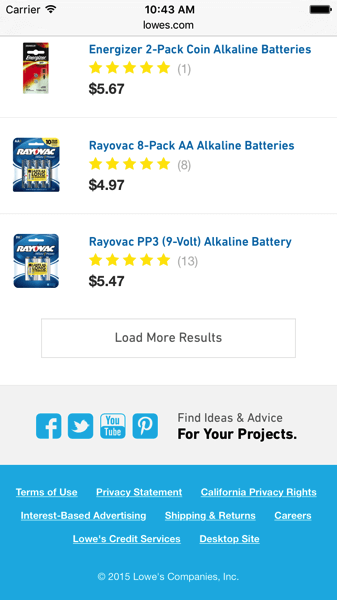 Lowe's에서 사용된 "더보기"버튼은 푸터에 접근할 수 있으면서 무한 스크롤의 많은 이점을 제공합니다.