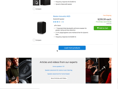 기본적으로 처음에 20개의 제품이 로드됩니다. 사용자가 10번째 제품으로 스크롤 하면 Crutchfield는 20개의 추가 제품을 지연로드합니다. 40번째 제품이 끝나면 사용자에게 `더보기`버튼이 표시됩니다.