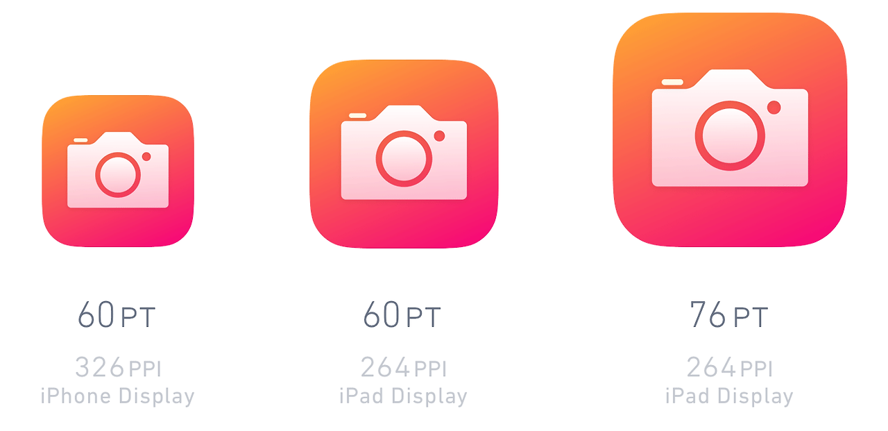 아이폰의 경우 아이콘의 크기가 60x60이지만 아이패드의 큰 화면은 더 많은 공간을 제공하므로 76x76 앱 아이콘을 사용할 때 더 실용적(및 시각적)인 효과가 있습니다.