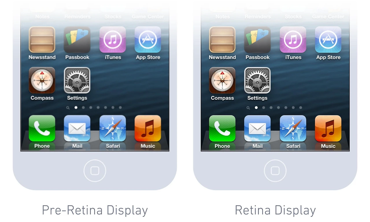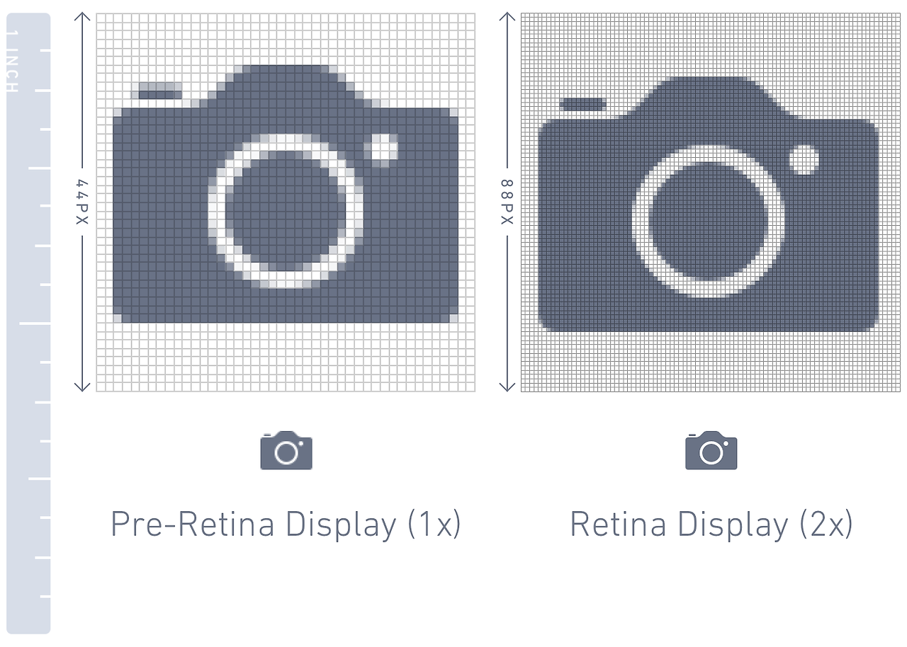 레티나 디스플레이에서 사용자 인터페이스(User interface, UI)가 기존과 동일한 물리적 크기를 유지하게 하려면 디자이너들은 픽셀 크기를 두 배로 키워서 디자인해야 합니다.(일반 화면에서 44px의 높이처럼 보이게 하기 위해 레티나 디스플레이에서는 88px로 키워서 디자인을 해야 합니다.)